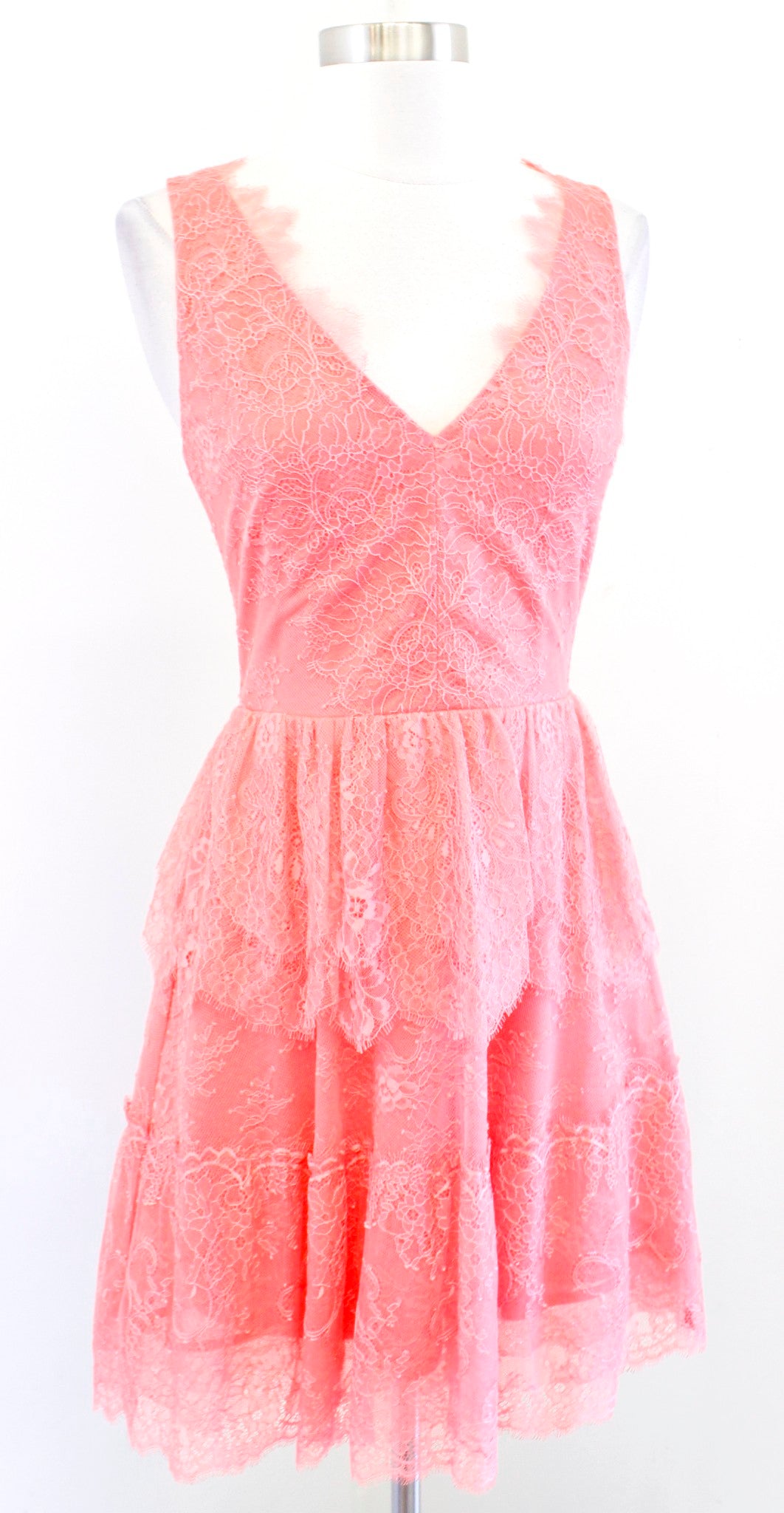 BCBG Max Azria Willa Poppy Coral Lace V Neck Tiered Cocktail Party Dress Size S