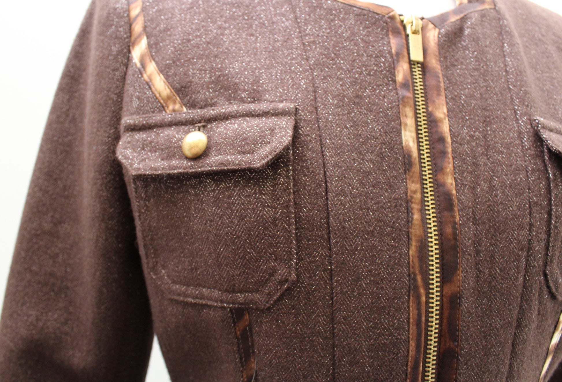 Cache Brown Shimmer Herringbone Wool Zip Front Jacket Size 4 Animal Leopard Trim
