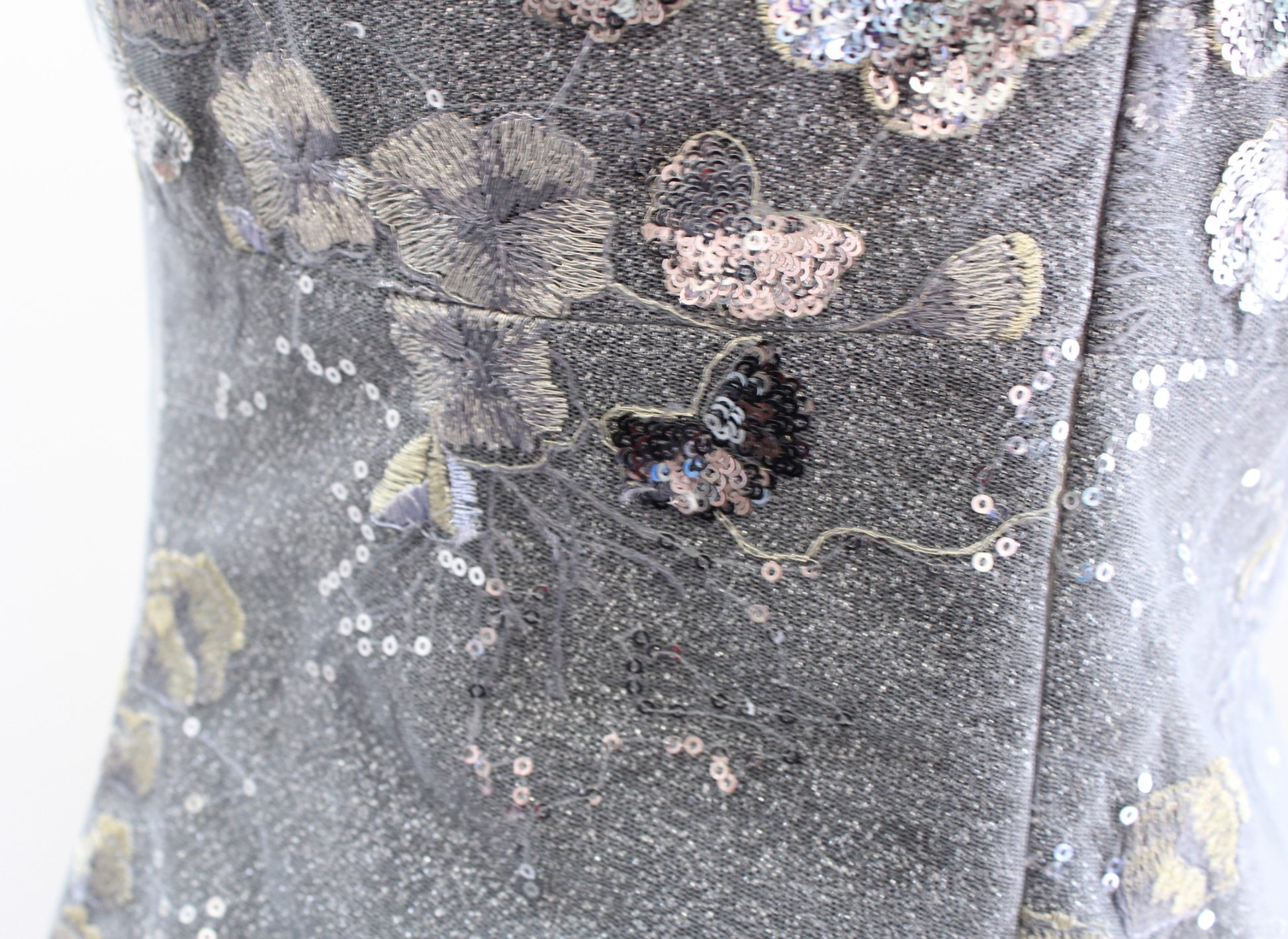 David Meister Gray Silver Gold Floral Embroidered Sequin Cocktail Dress Size 2