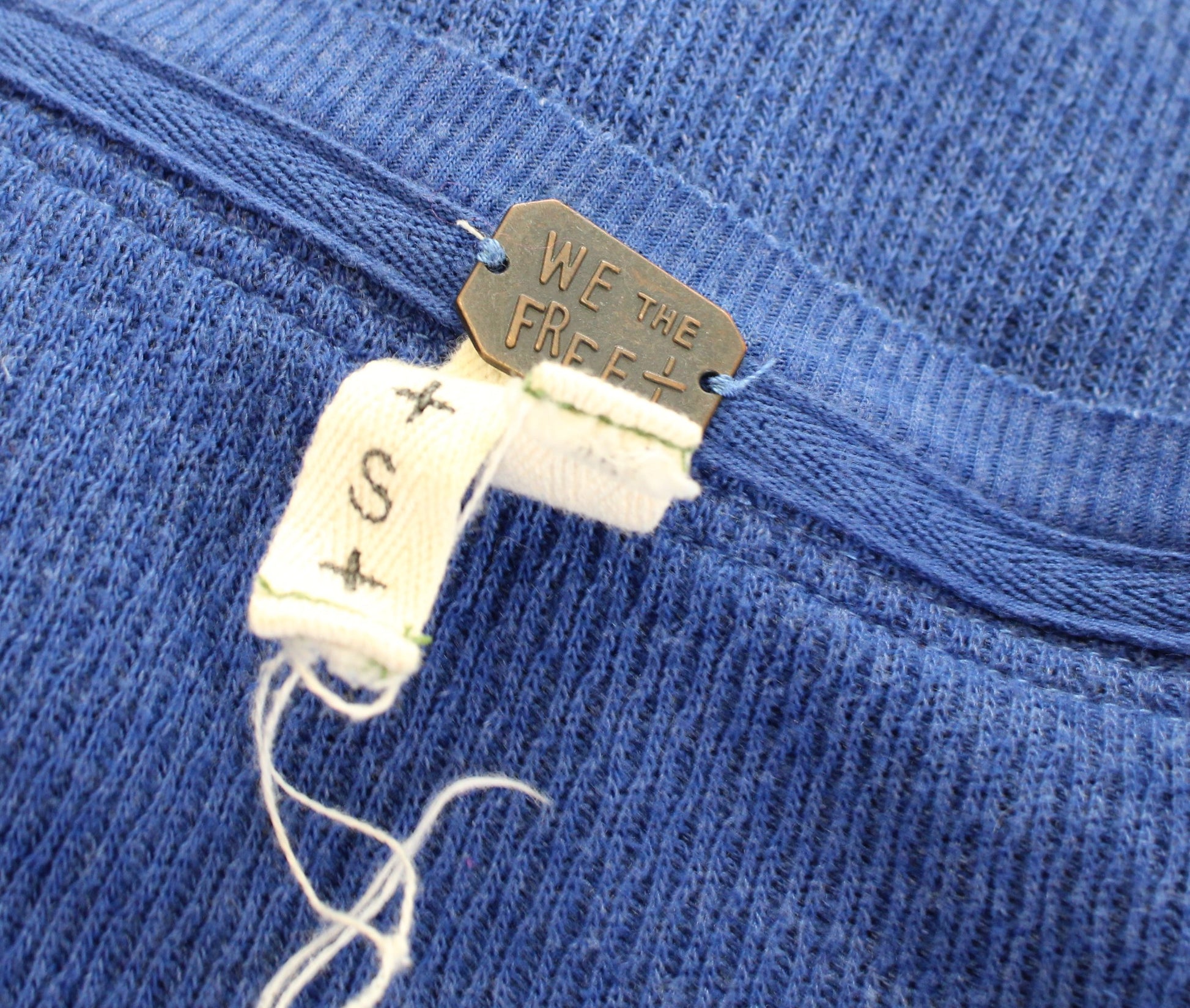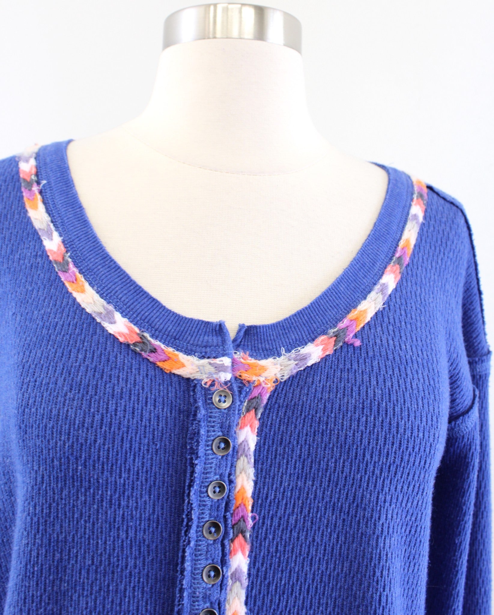 Free People Rainbow Thermal Blue Knit Henley Top Blouse Size S Scoop Neck