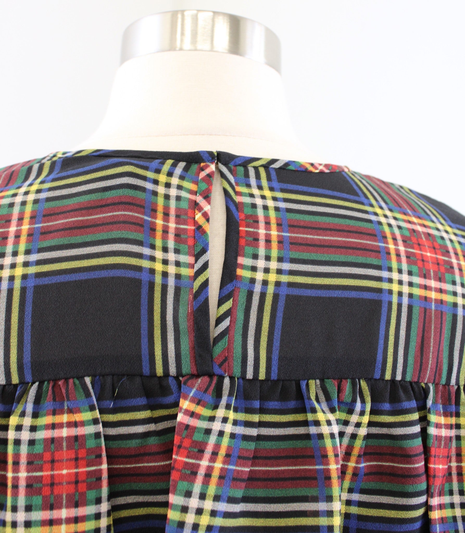 J Crew Edie Ruffle Top in Stewart Tartan Plaid Size 2 Black Red Popover Blouse Short Sleeve