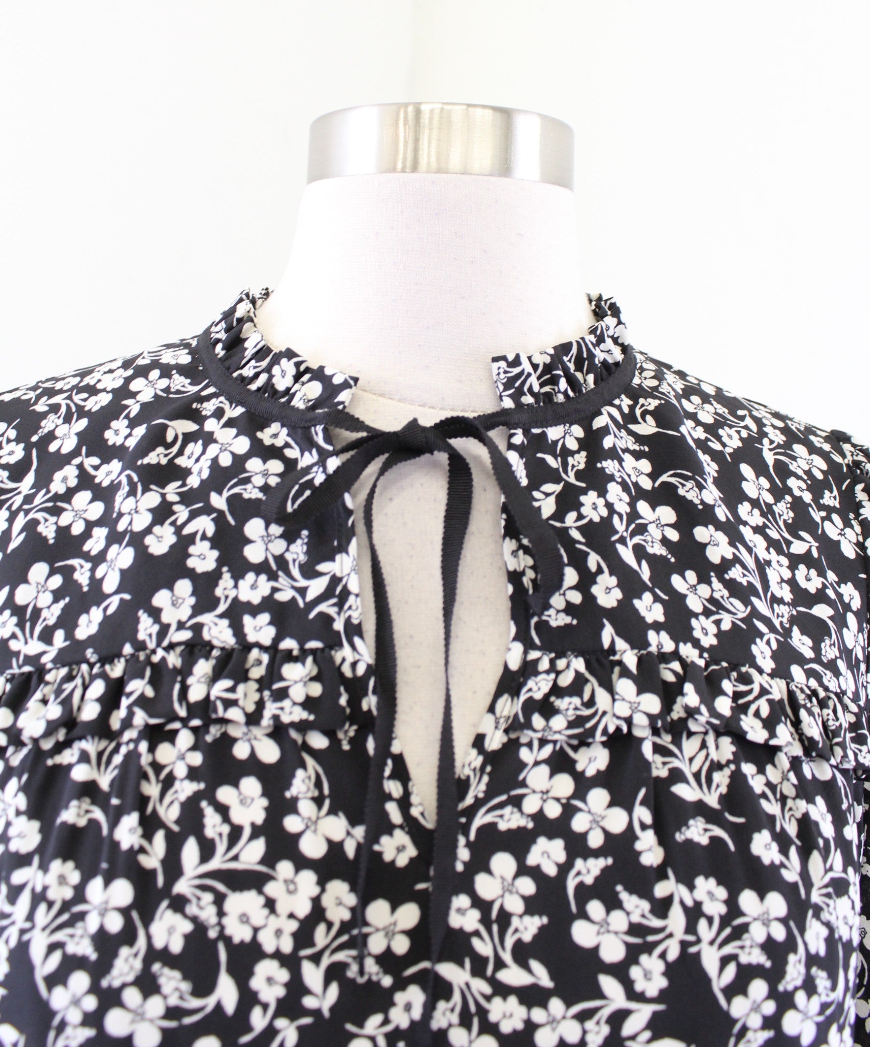 J Crew Point Sur Black White Blossom Floral Tie Neck Silk Blouse Top Size XS