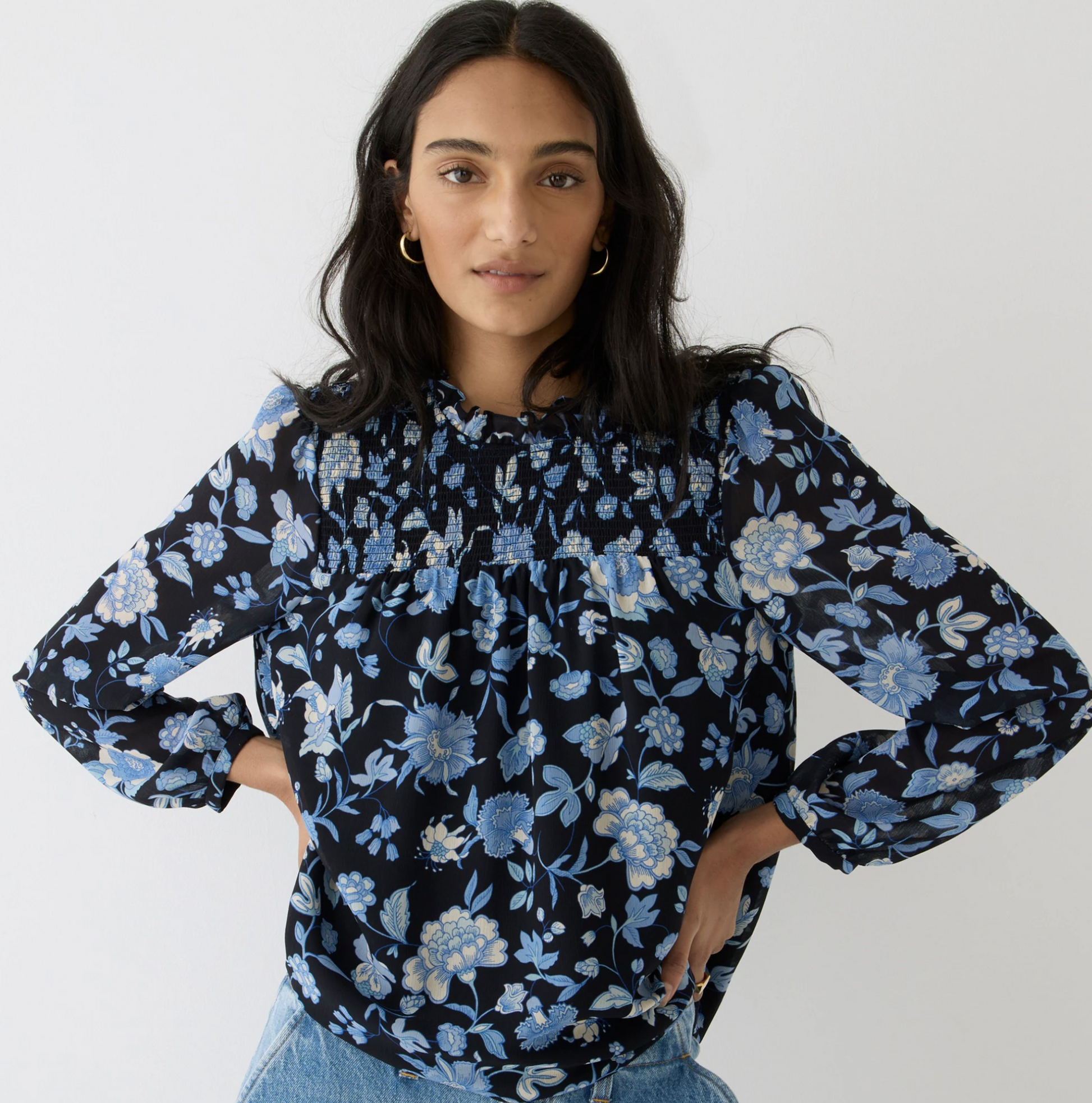 J Crew Ruffle Neck Chiffon Top in Midnight Blue Black Floral Size S Blouse Long Sleeve
