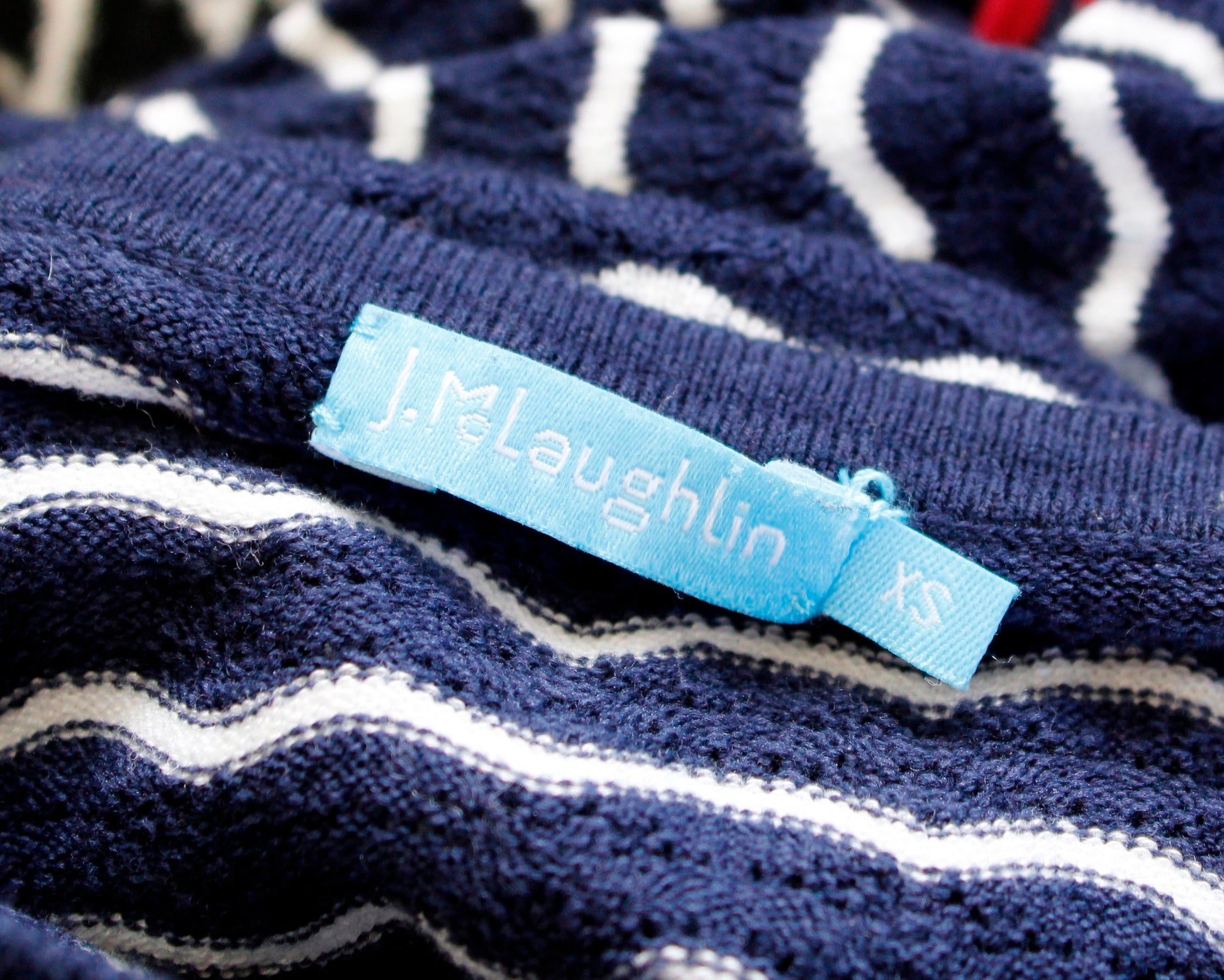 J McLaughlin Navy Blue White Squiggle Stripe Eyelet Knit Sweater Top Size XS