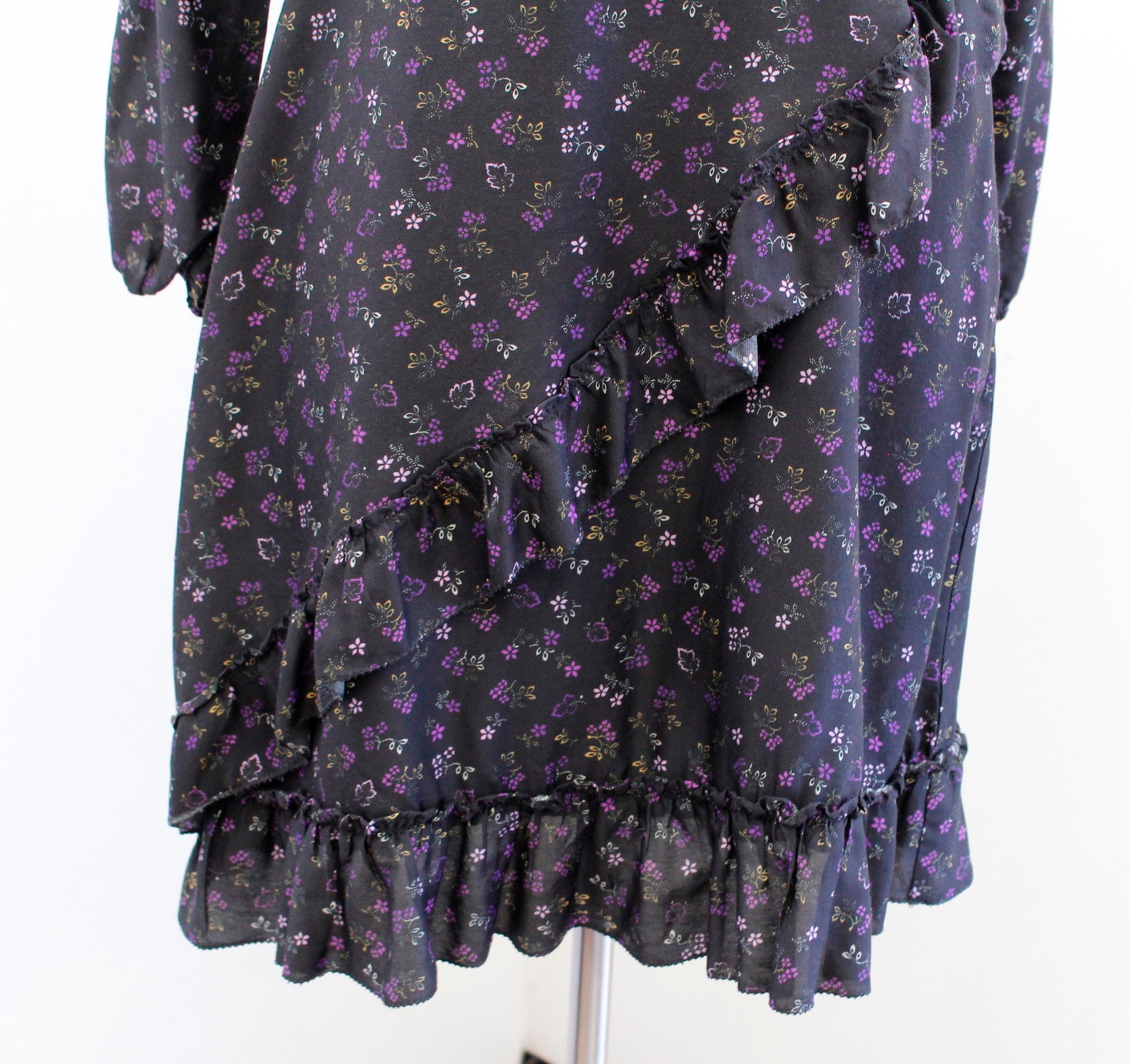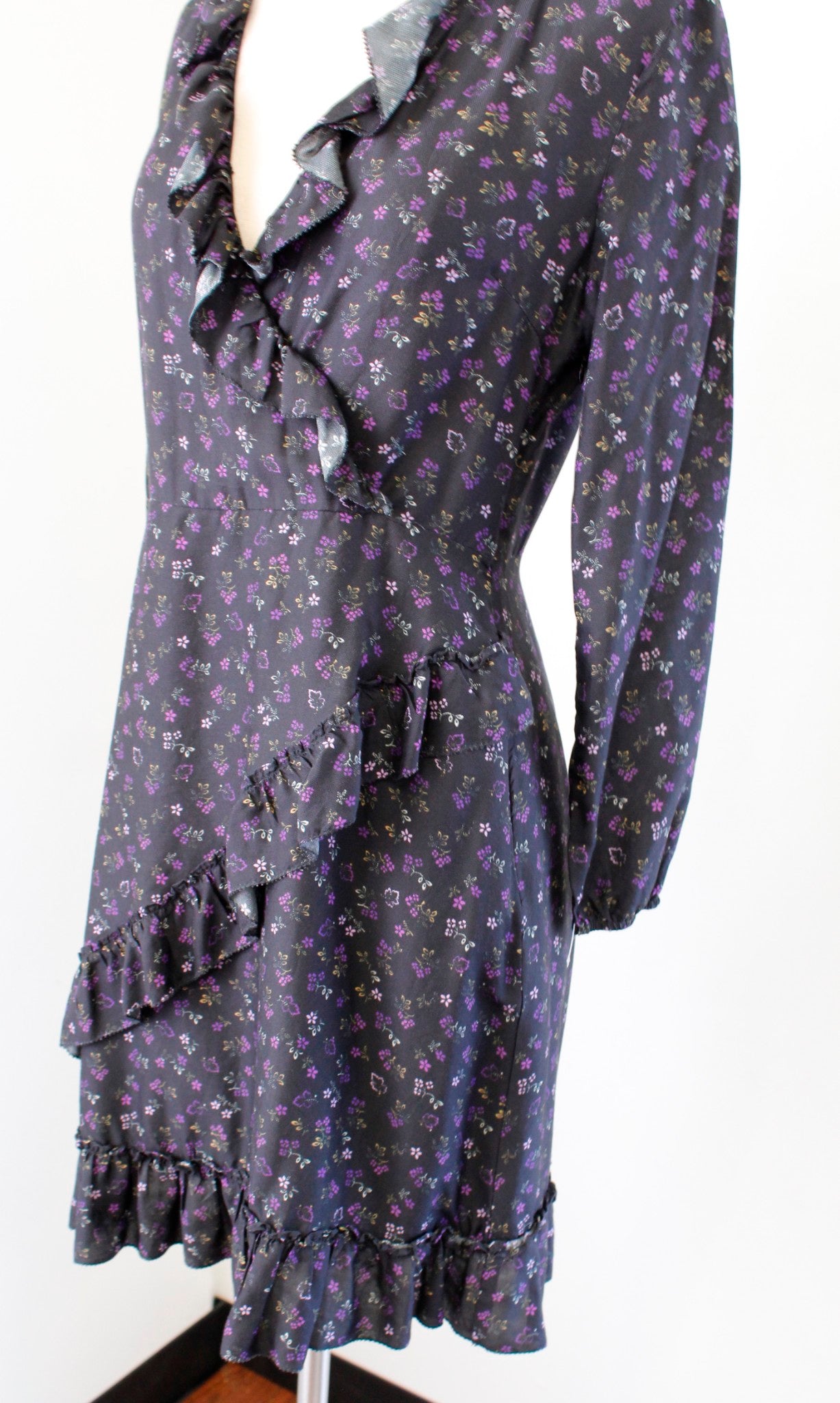 J McLaughlin Sonny Black Purple Floral Print Ruffle Faux Wrap Dress Size 2 Silk