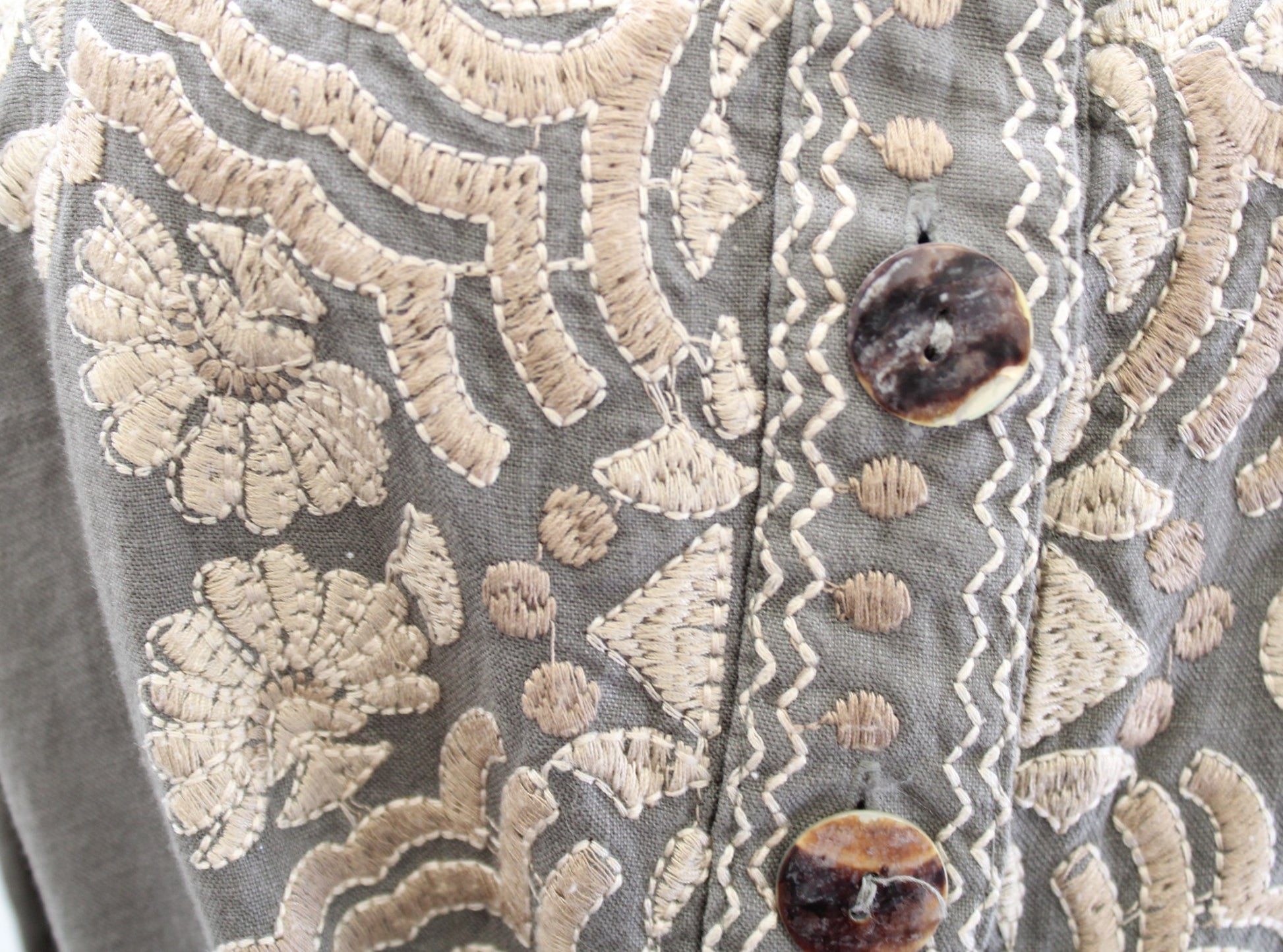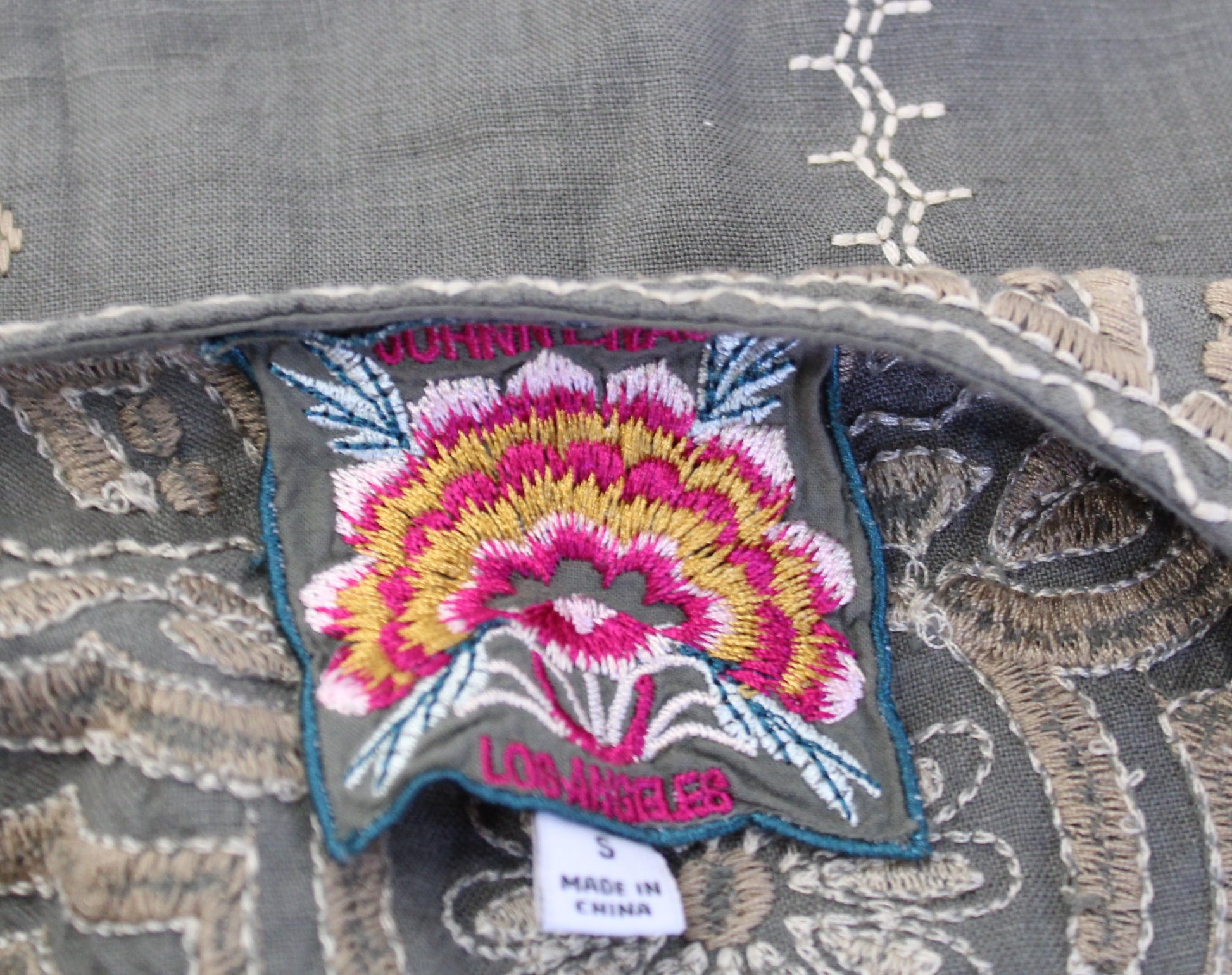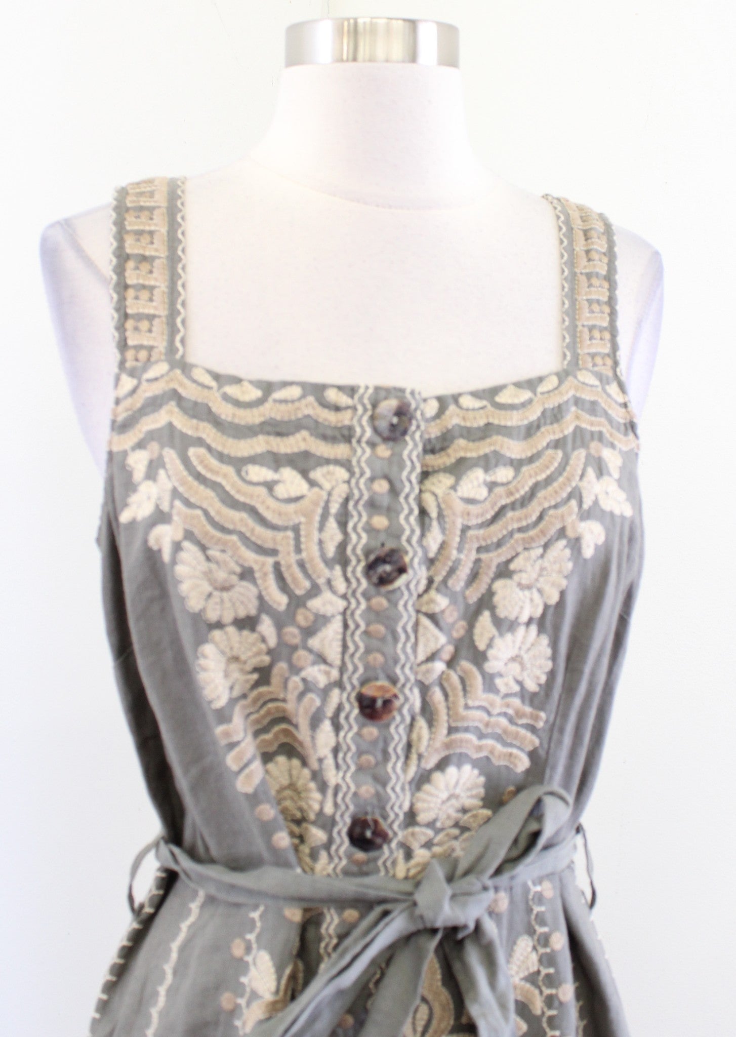 Johnny Was Green Ornate Floral Embroidered Button Front Tie Waist Linen Dress S