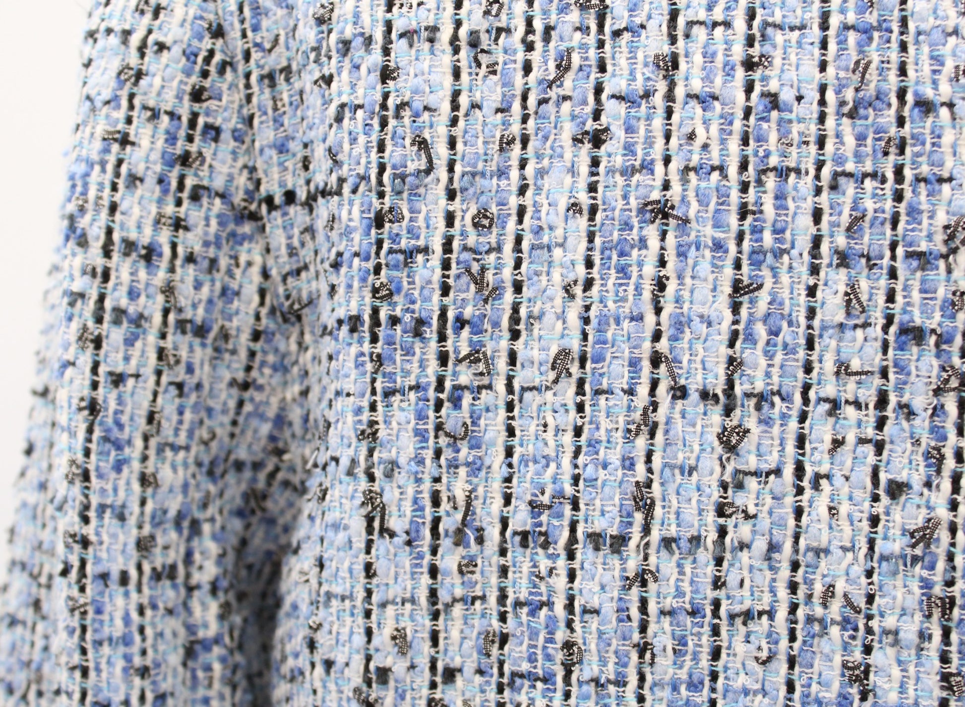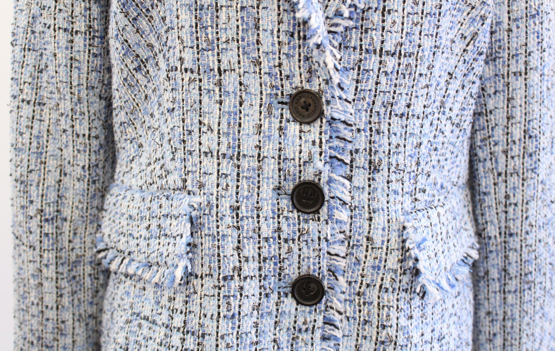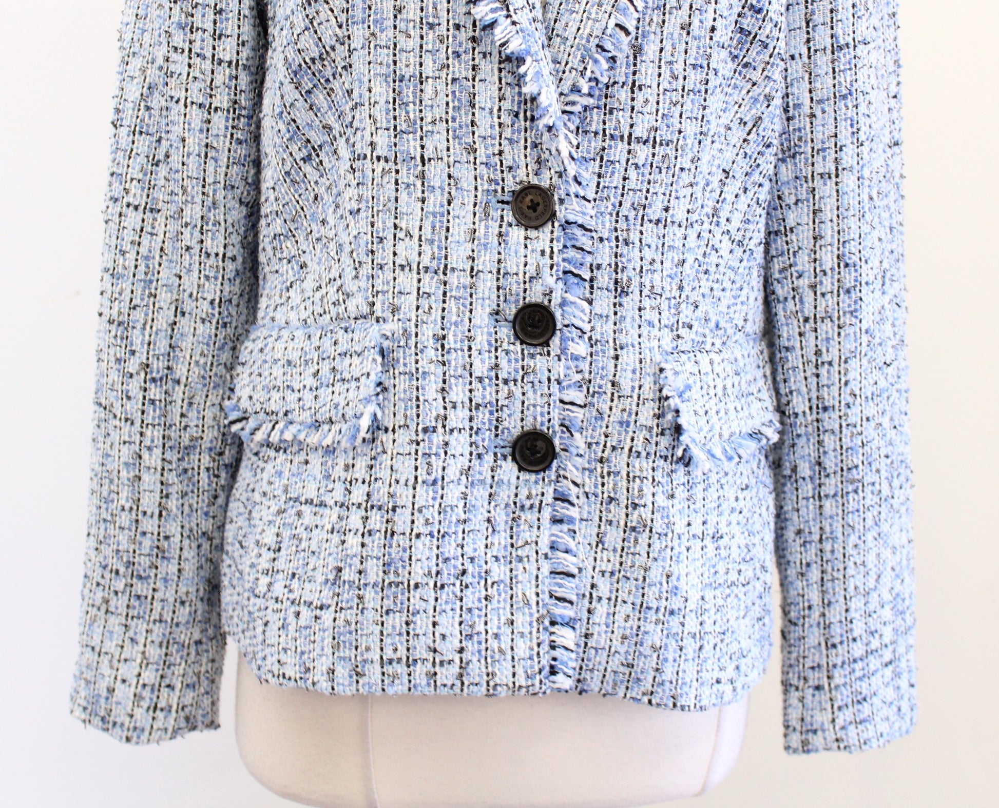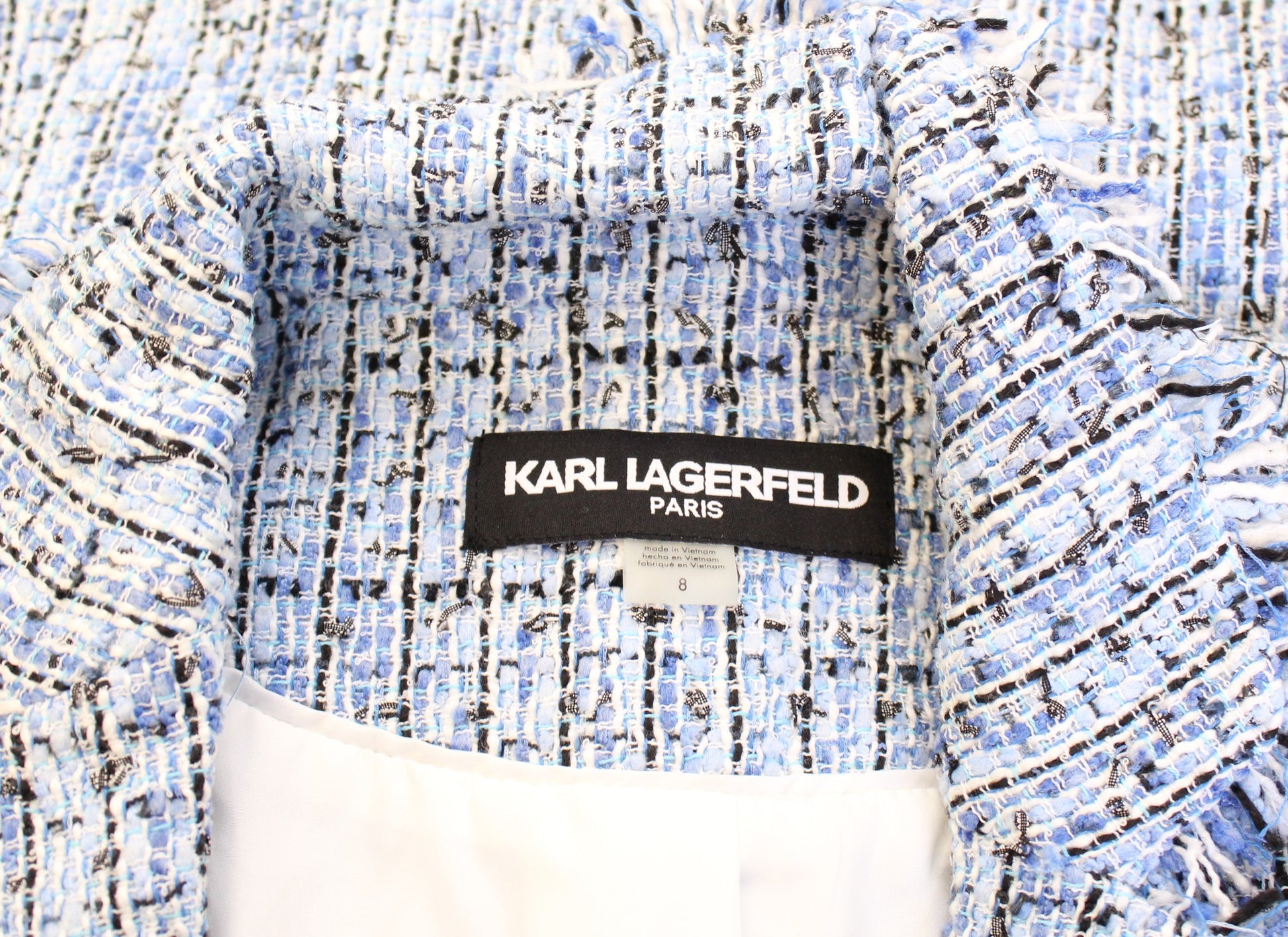 Karl Lagerfeld Blue Black White Tweed Fringe Blazer Suit Jacket Size 8 Career