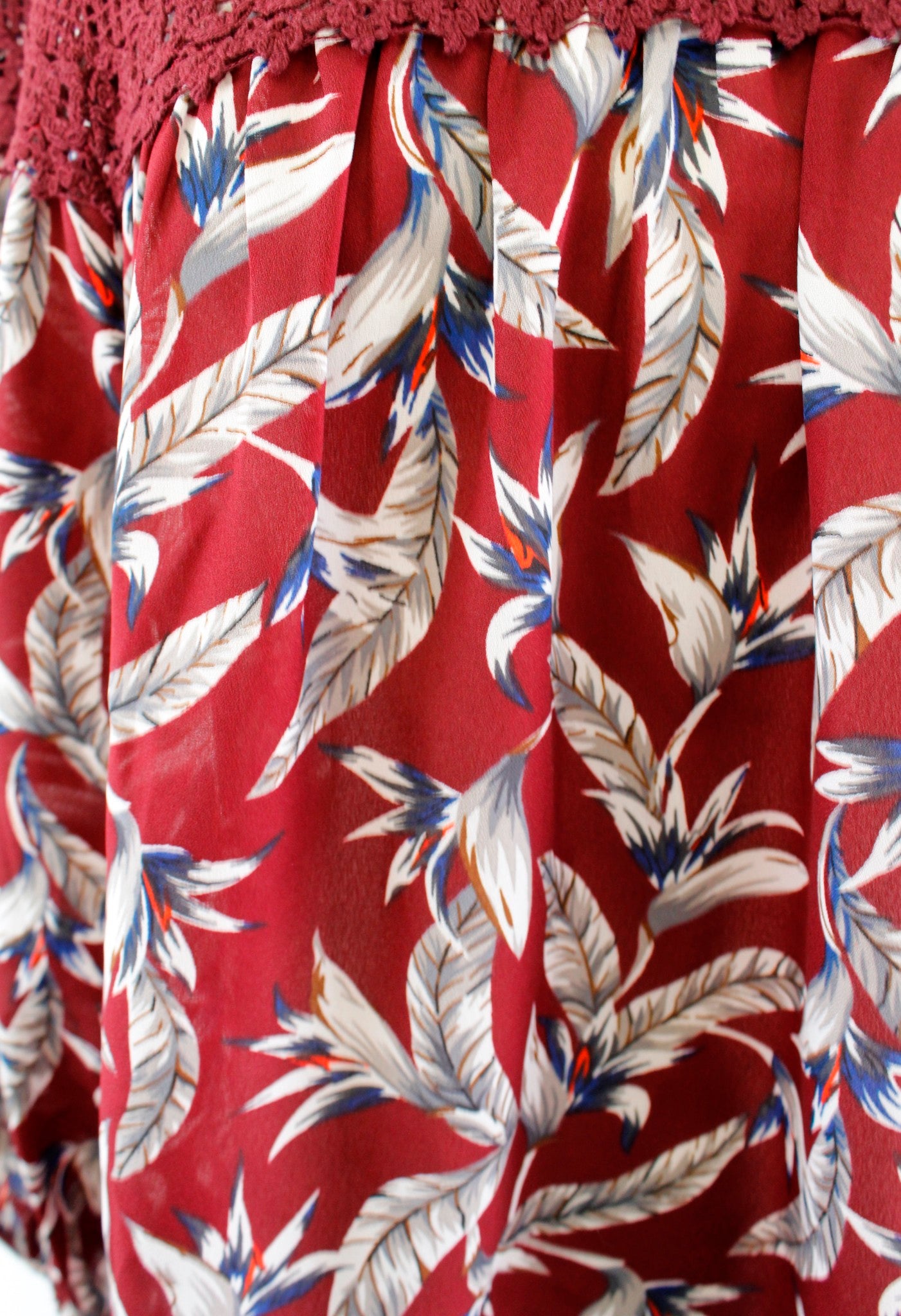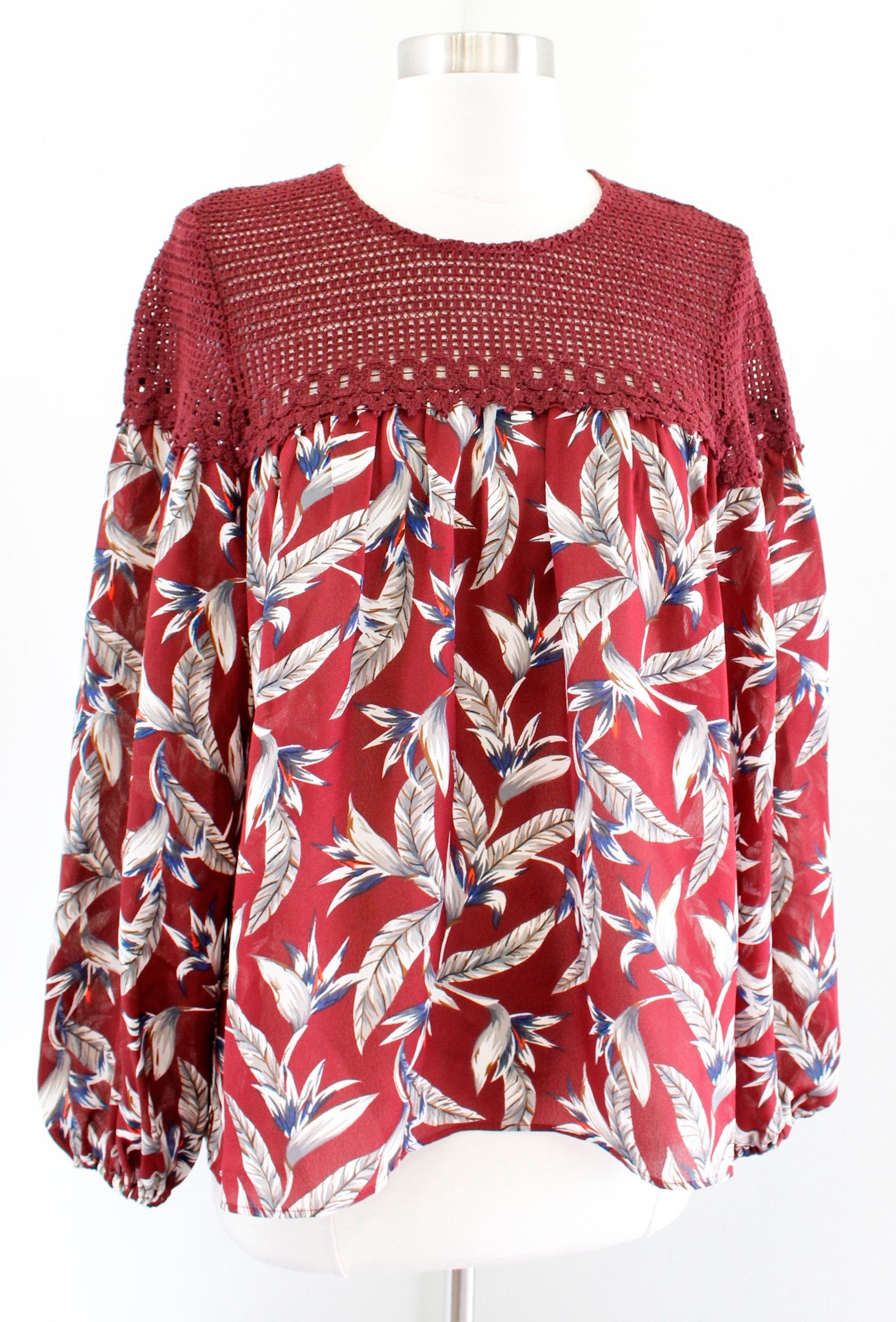 Mynahs Renyu Taandon Anthropologie Burgundy Red Floral Crochet Top Blouse Sz XS Long Sleeve
