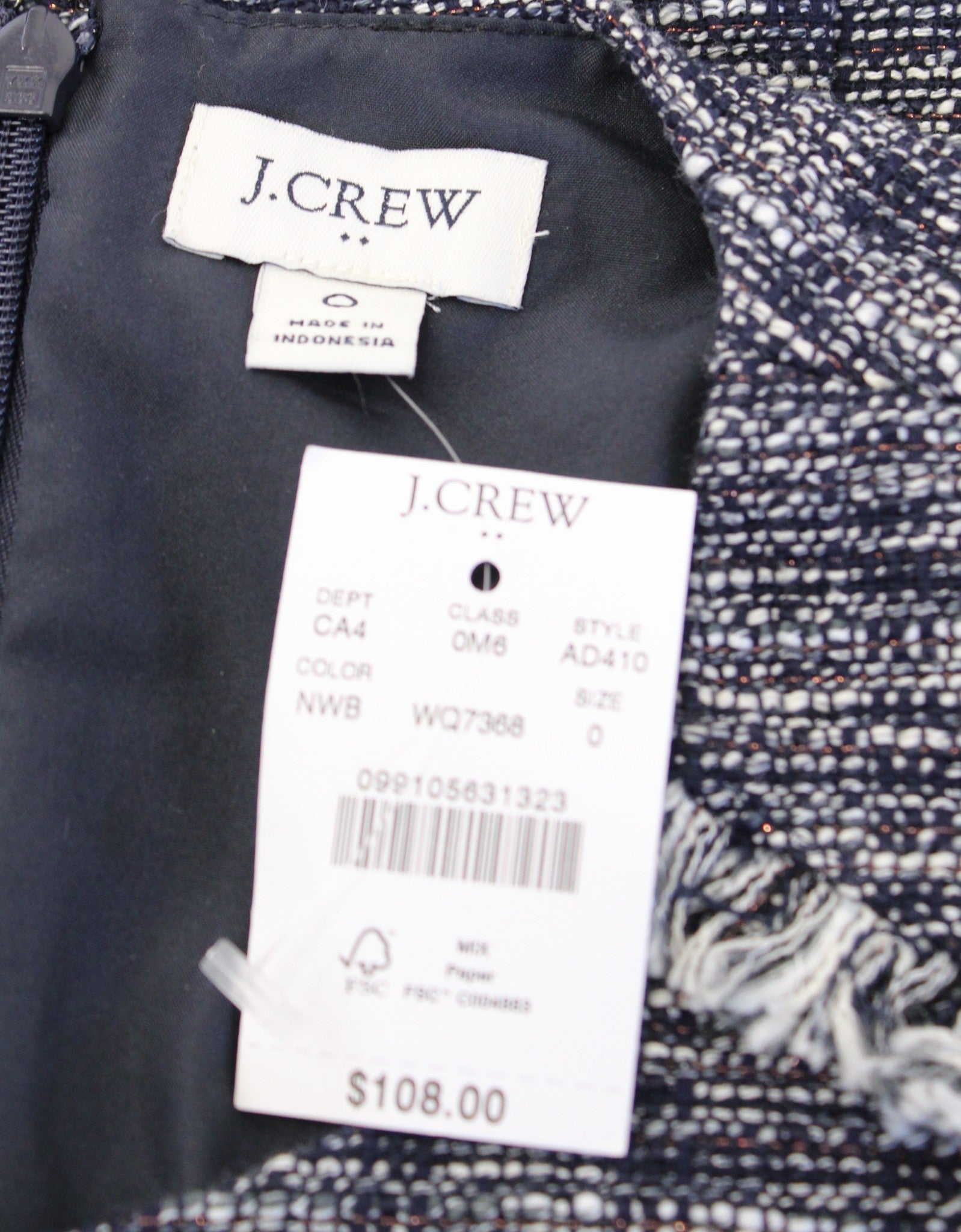 NWT $108 J Crew Navy Blue Metallic Shimmer Tweed Fringe Sheath Dress Size 0