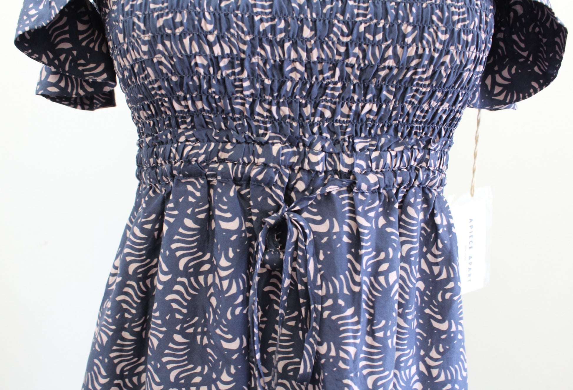 NWT Apiece Apart Lamu Blue Silk Smocked Ruffle Off the Shoulder Midi Dress Sz 2