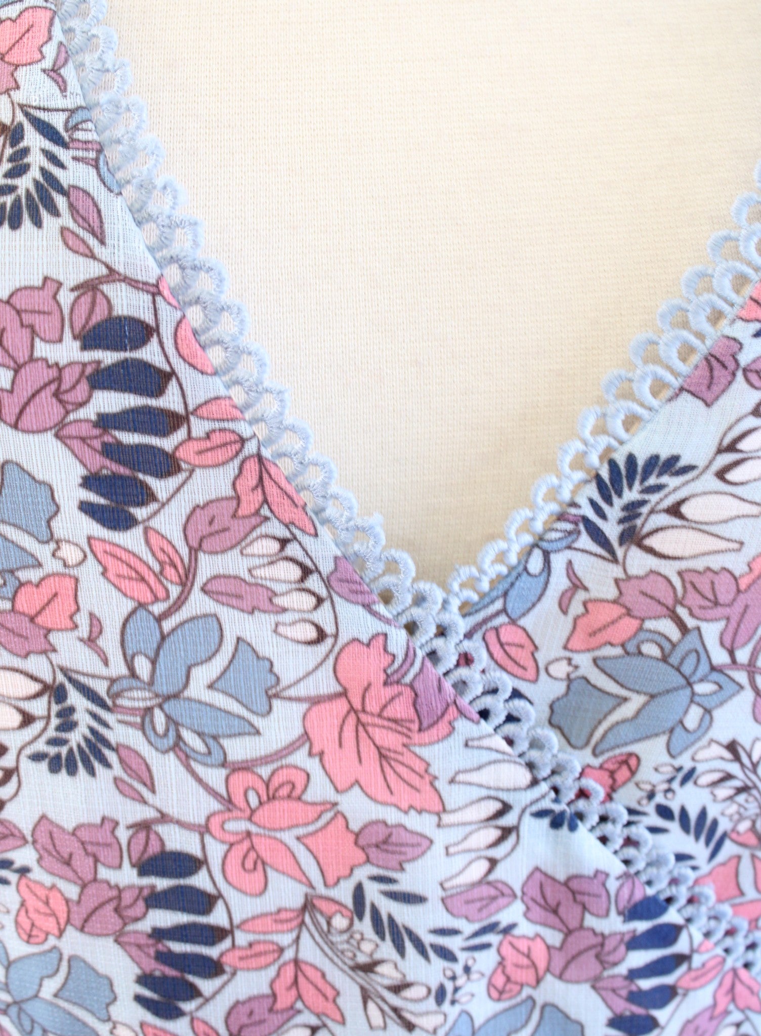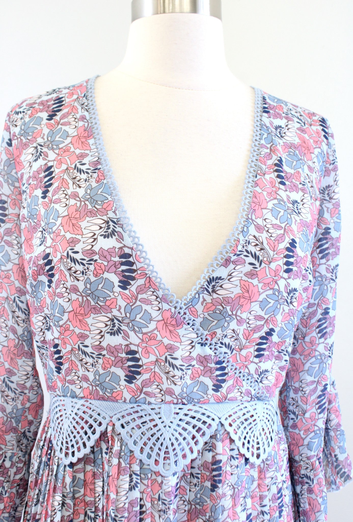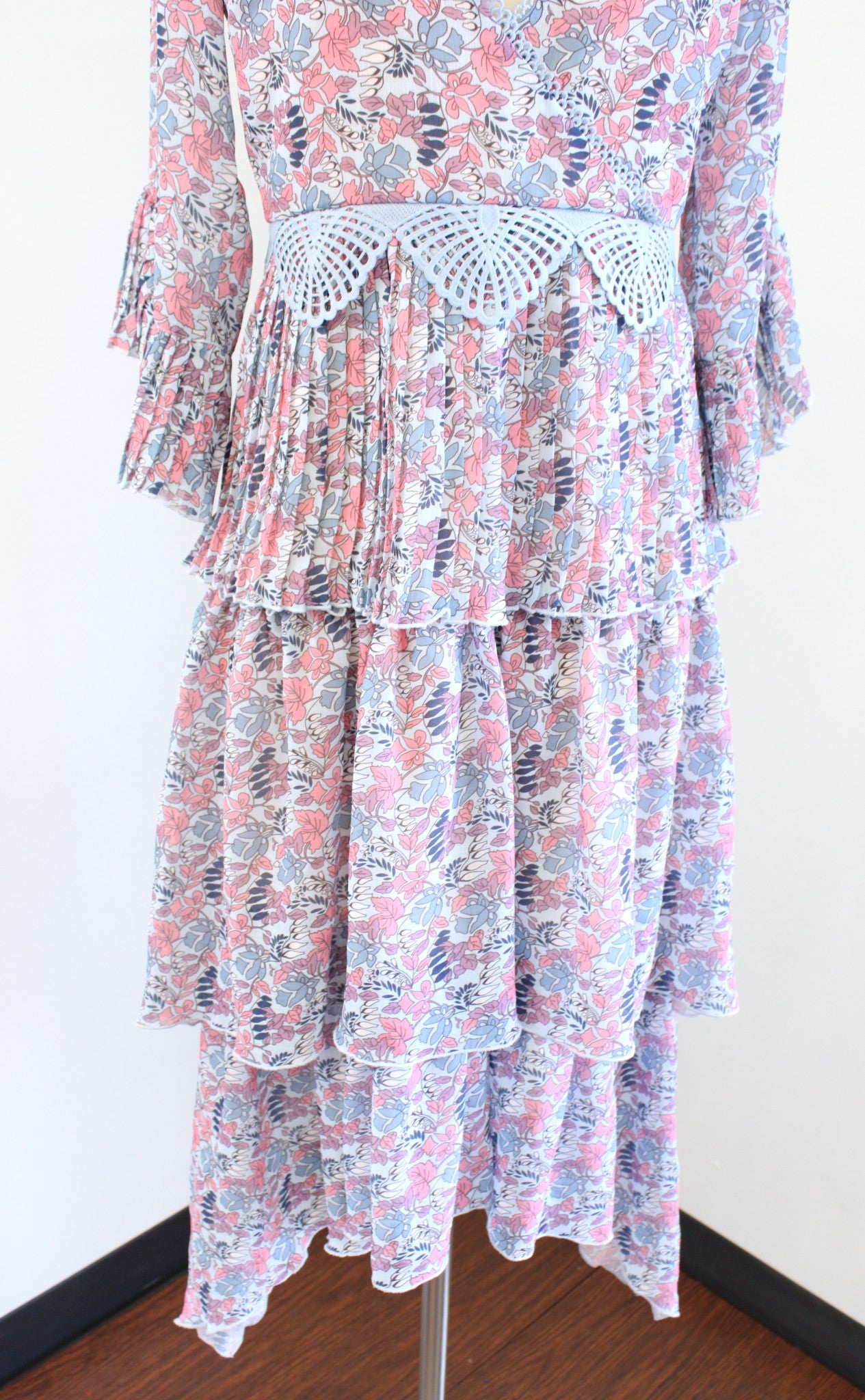NWT Foxiedox Blue Pink Floral Tiered Pleated Lace Trim Midi Dress Size S Boho
