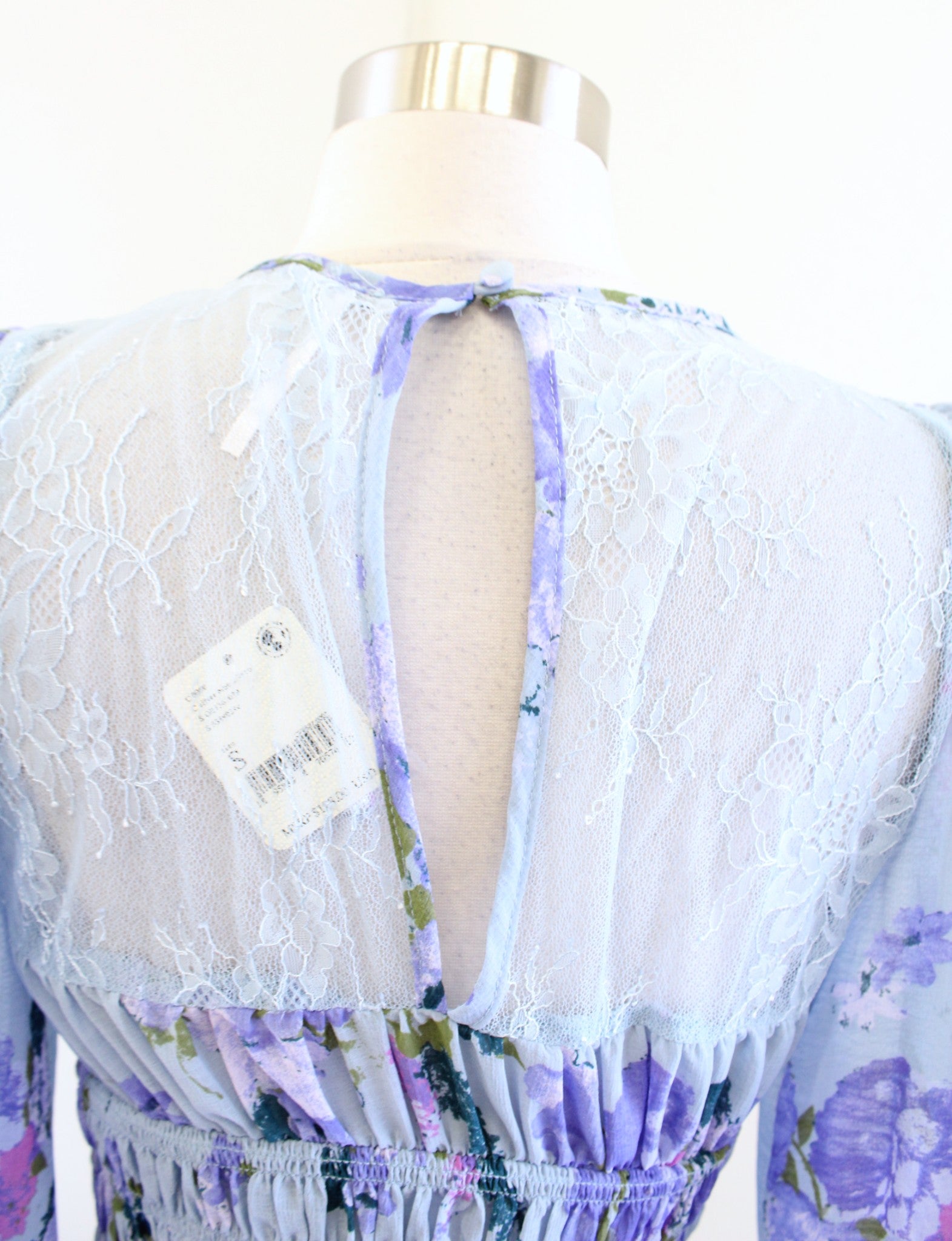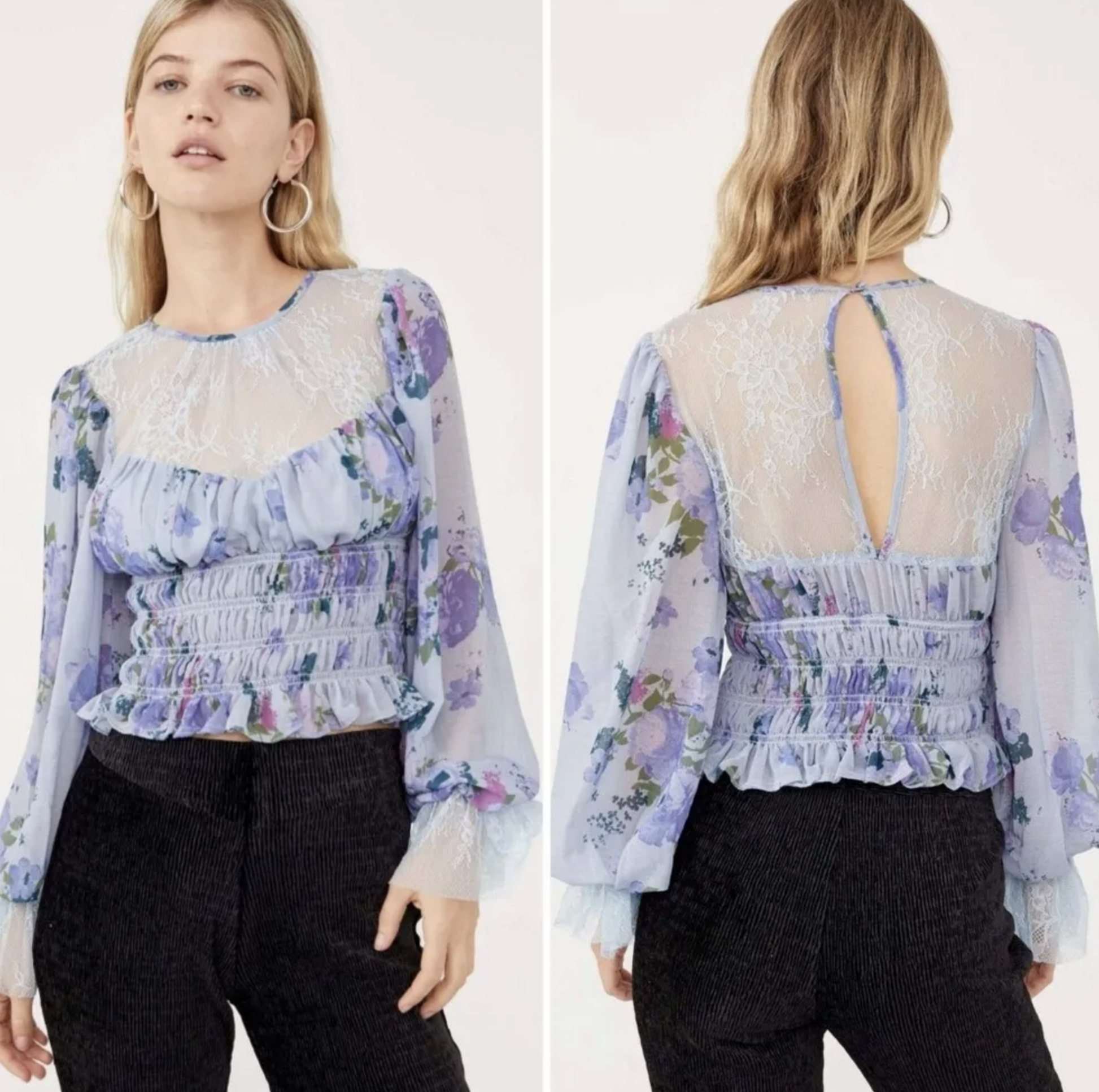 NWT Free People Daphne Blue Floral Lace Smocked Top Blouse Size S Cropped Boho
