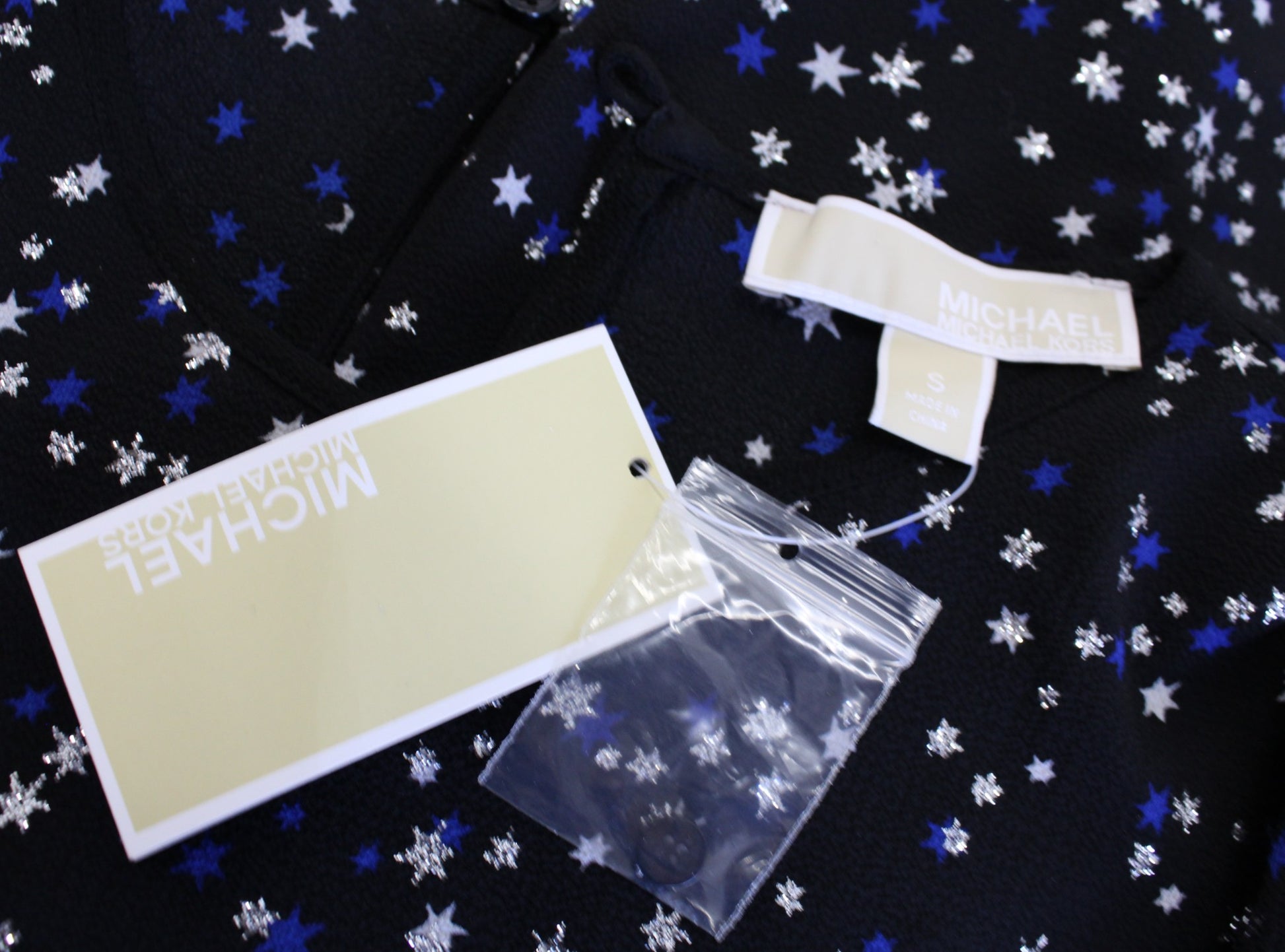 NWT Michael Kors Black Blue Silver Shimmer Star Print Bell Sleeve Top Blouse S Long Sleeve