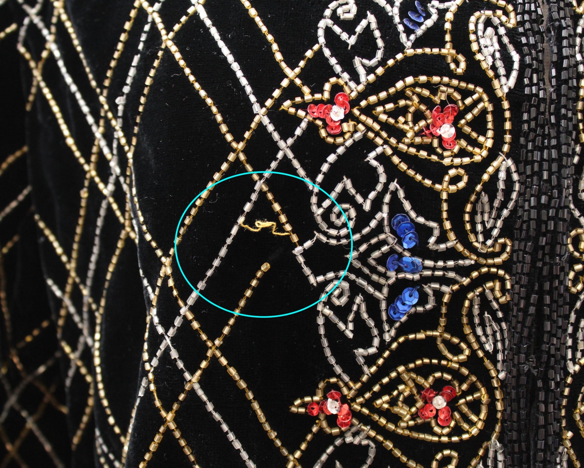 Has original tags attached, unworn. *I did notice one small spot of missing beads on the front- see last photo. Very minor.
