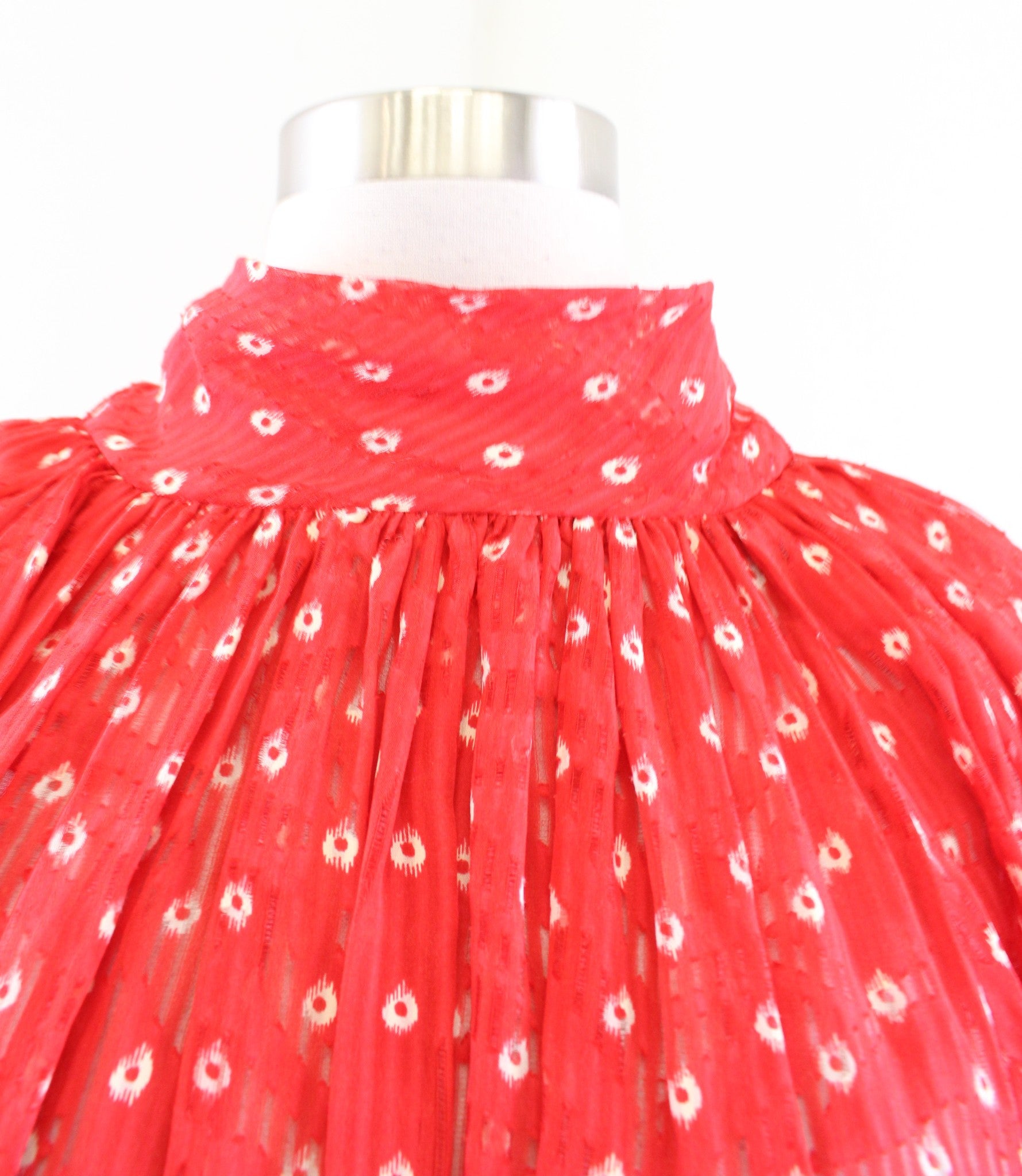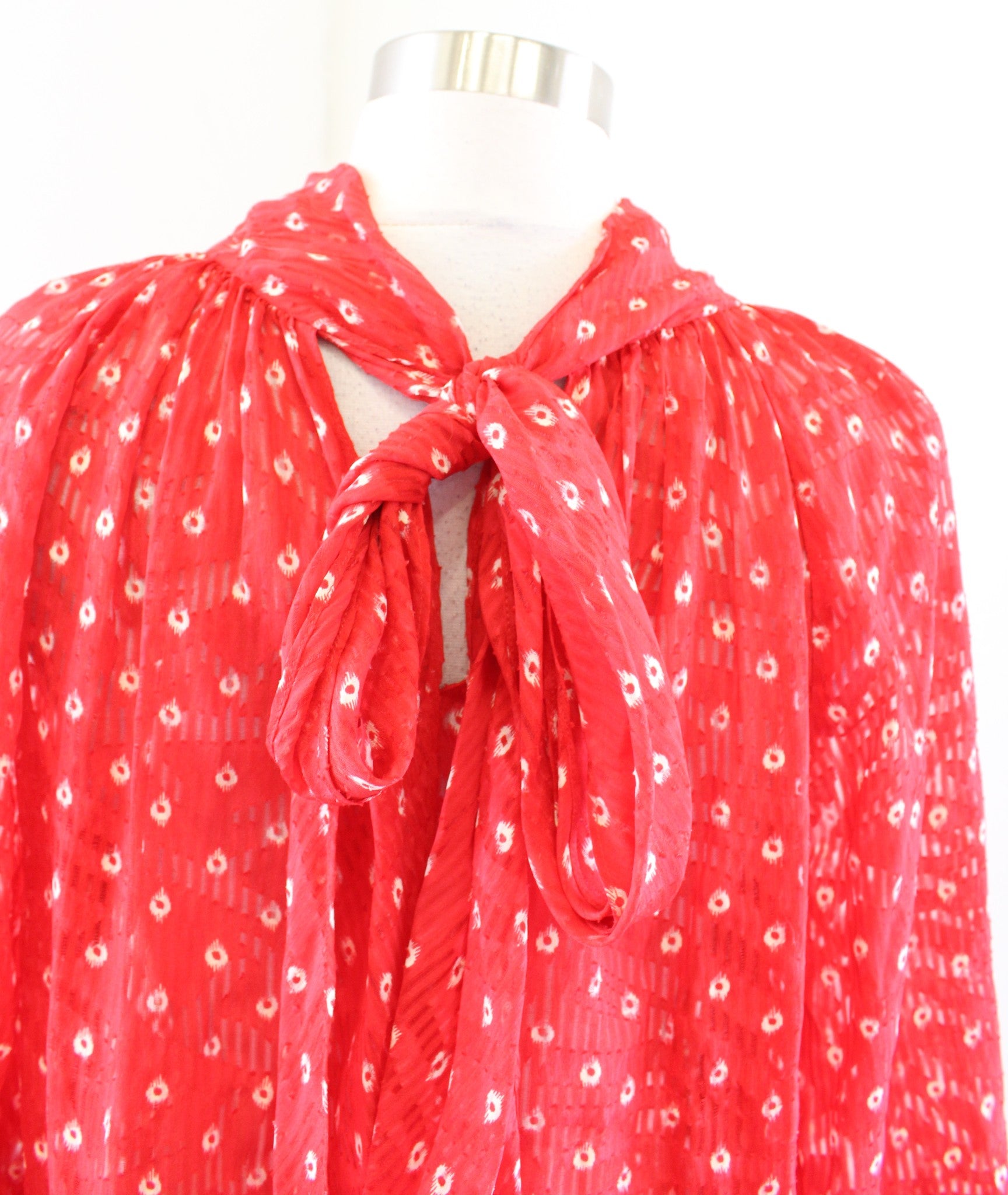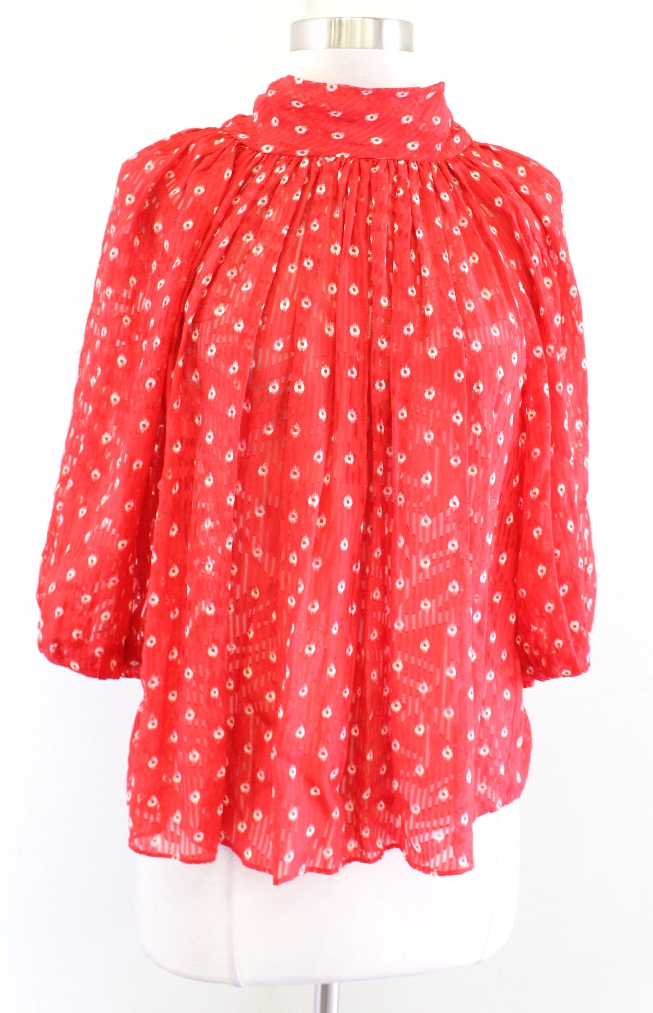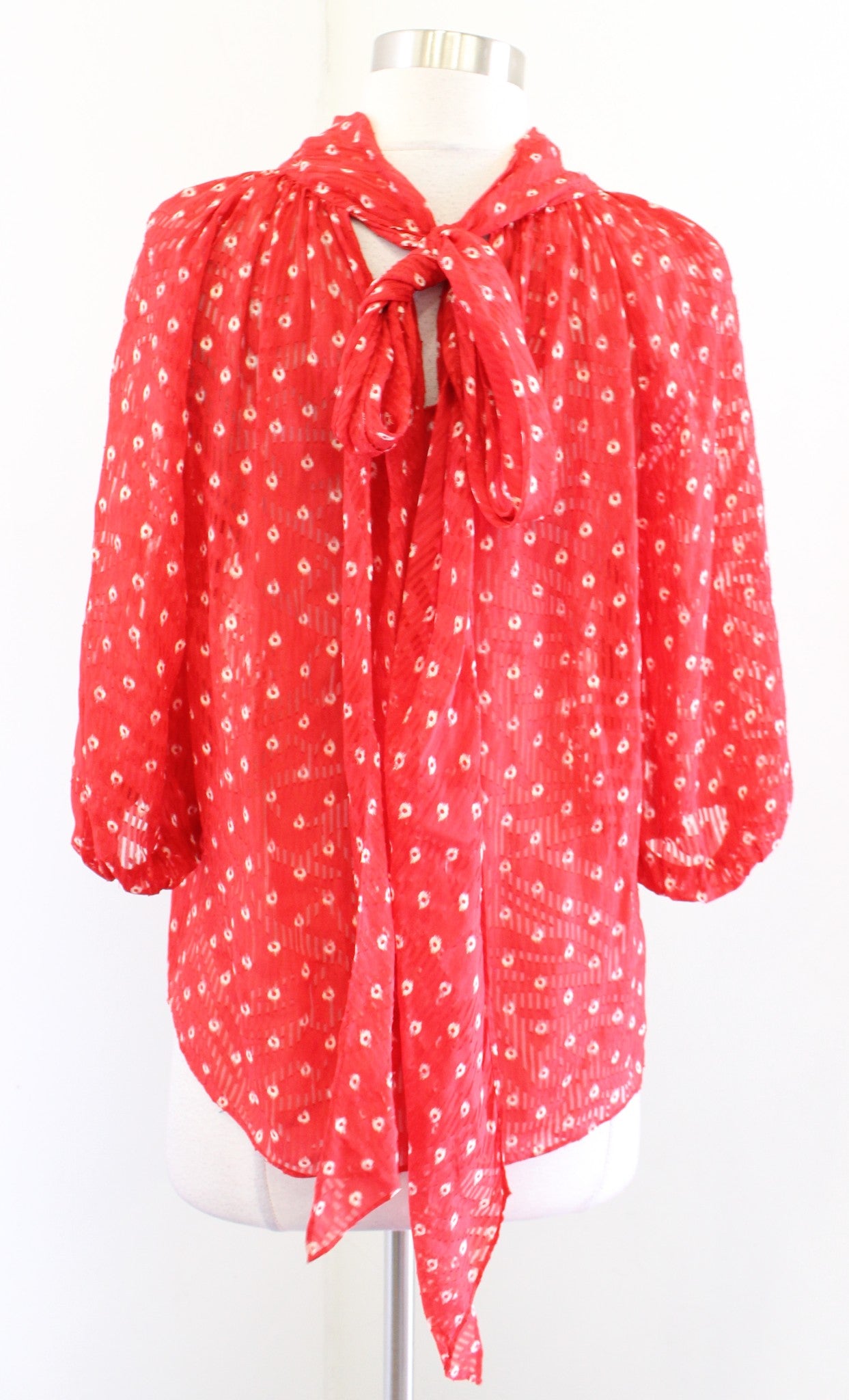 Rebecca Taylor Puff Sleeve Tie Neck Sunrise Dot Top Blouse Lava Red Size 6 Silk