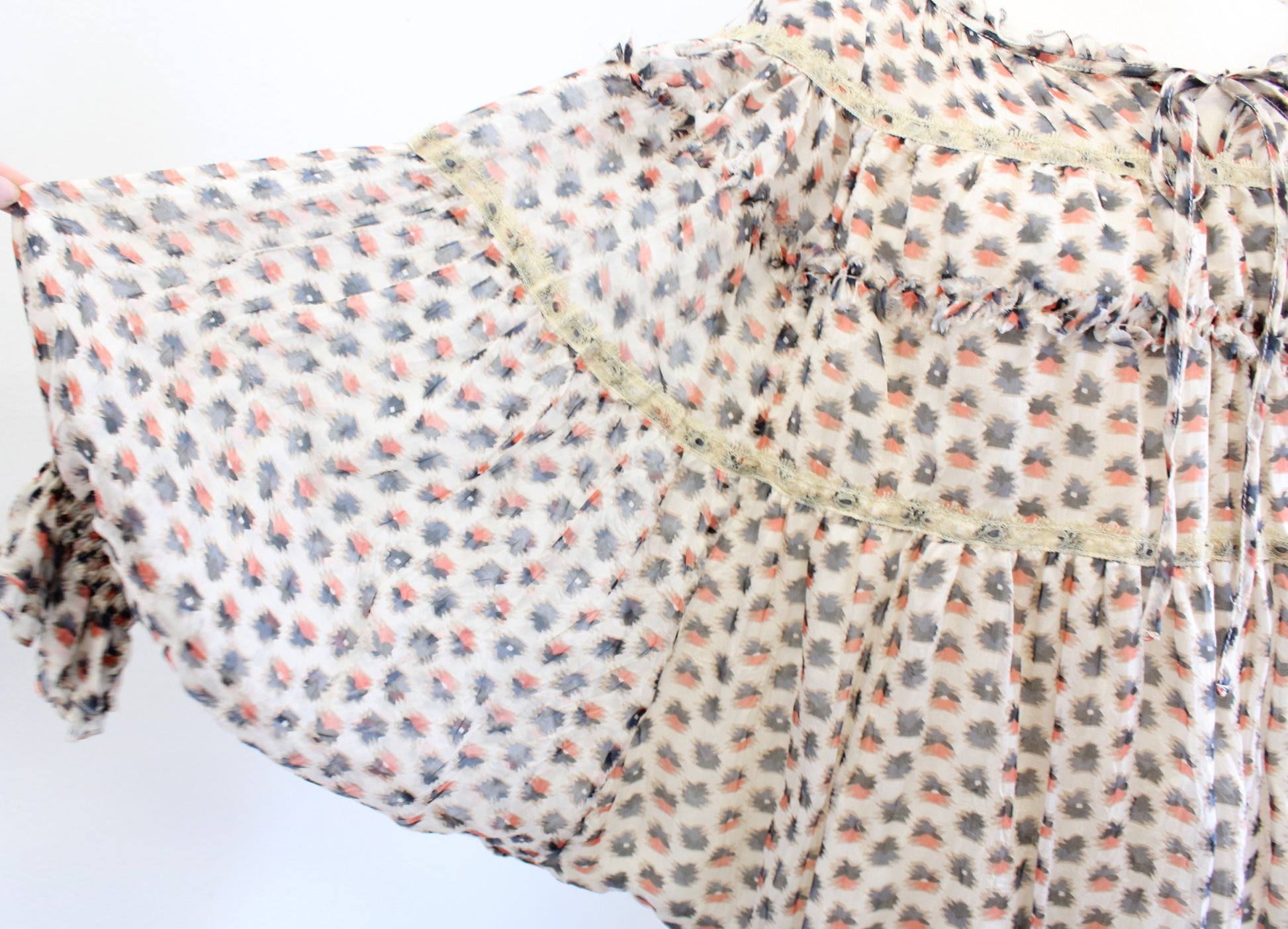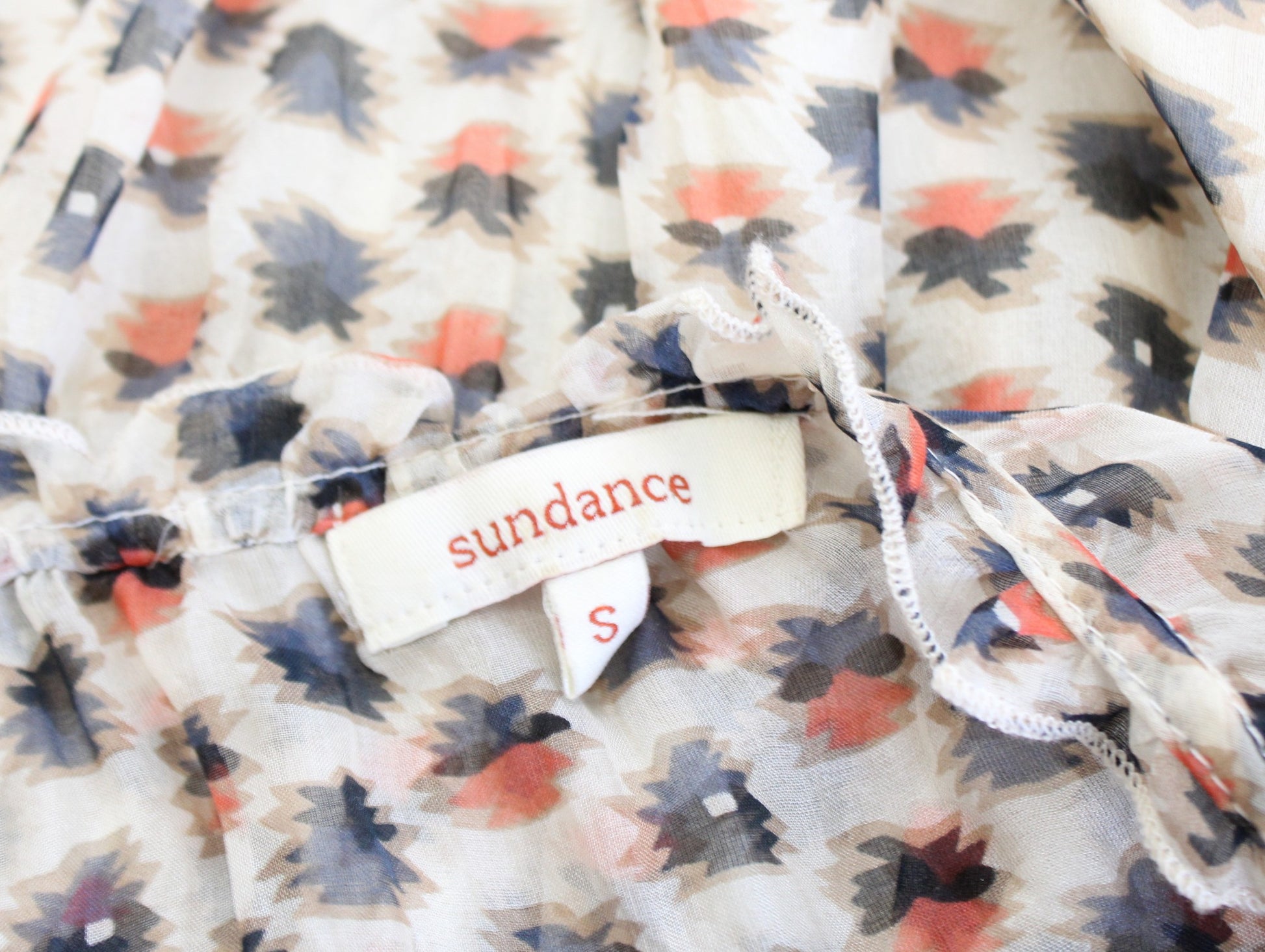 Sundance Catalog Geometric Print Lace Trim Smocked Silk Peasant Top Blouse Sz XS
