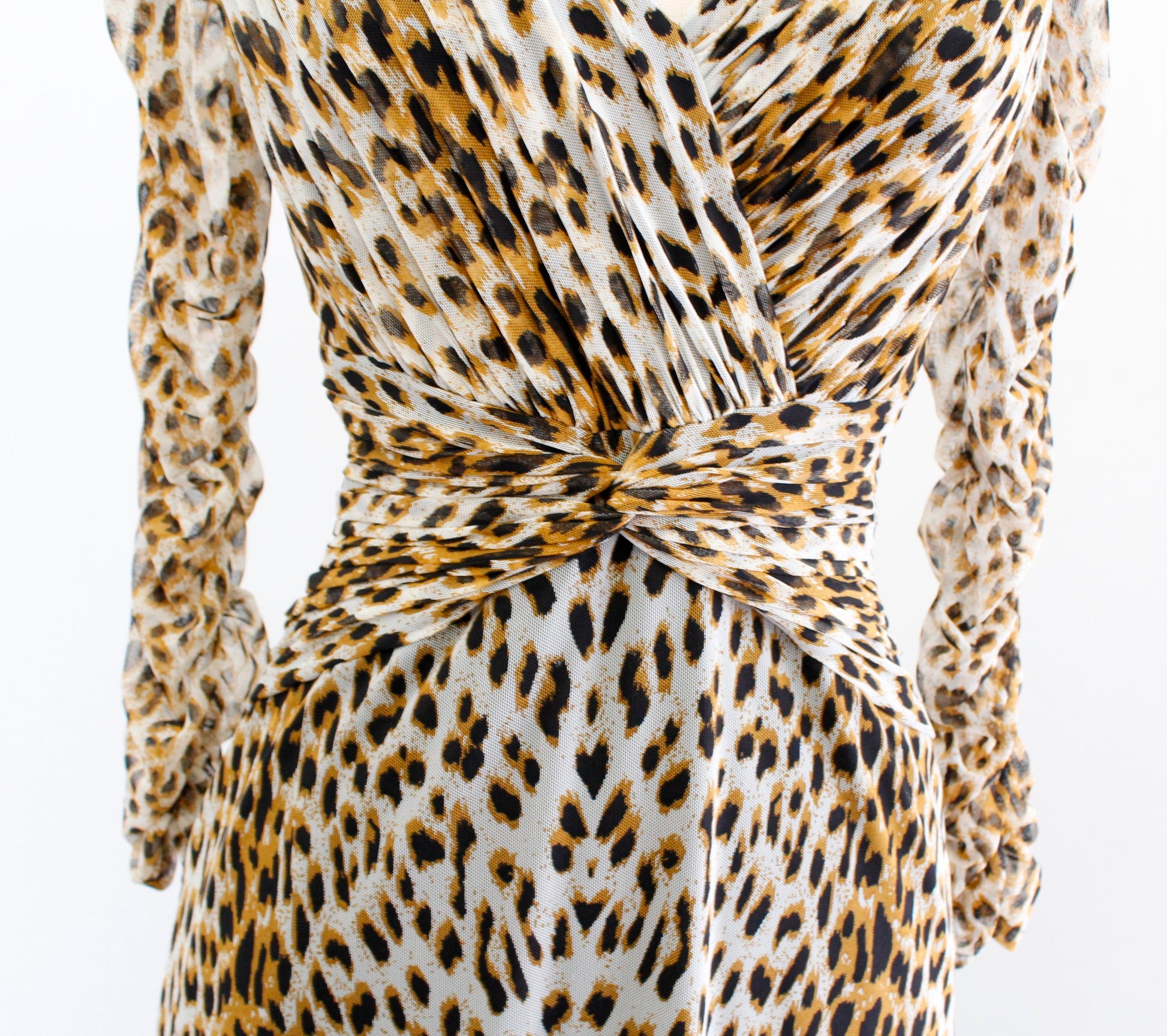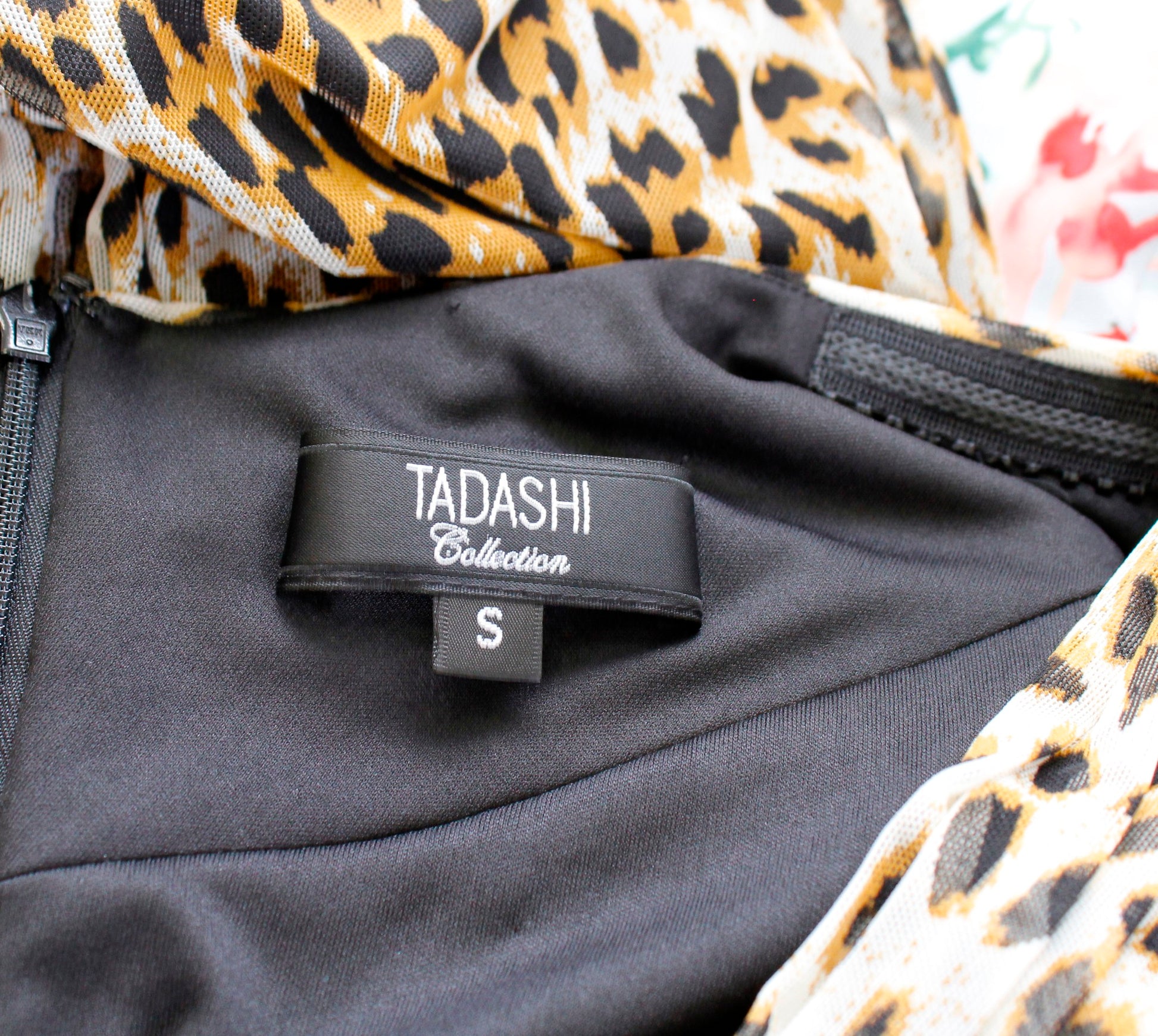 Tadashi Collection Mesh Leopard Print V Neck Ruched Cocktail Evening Dress Sz S