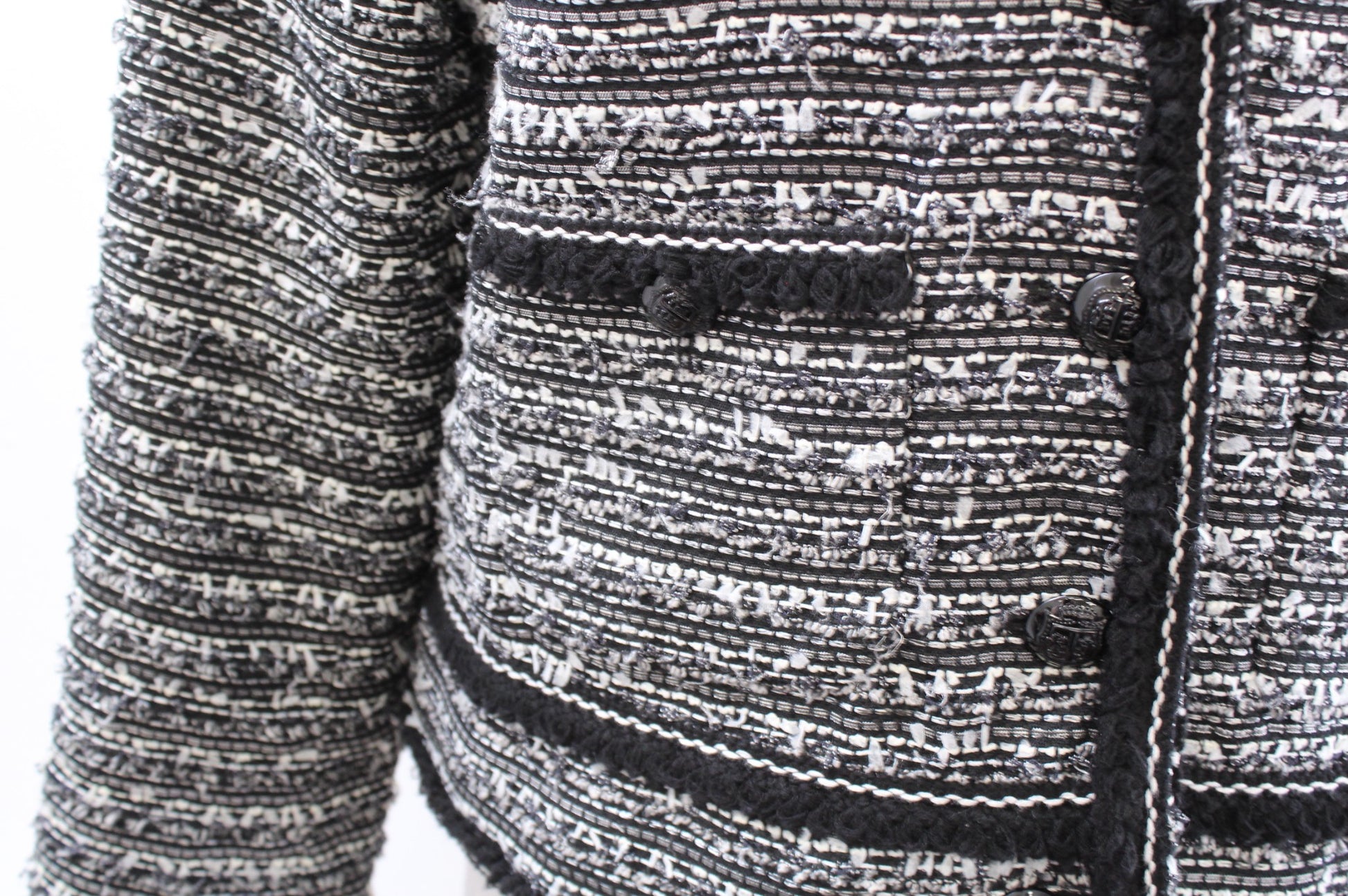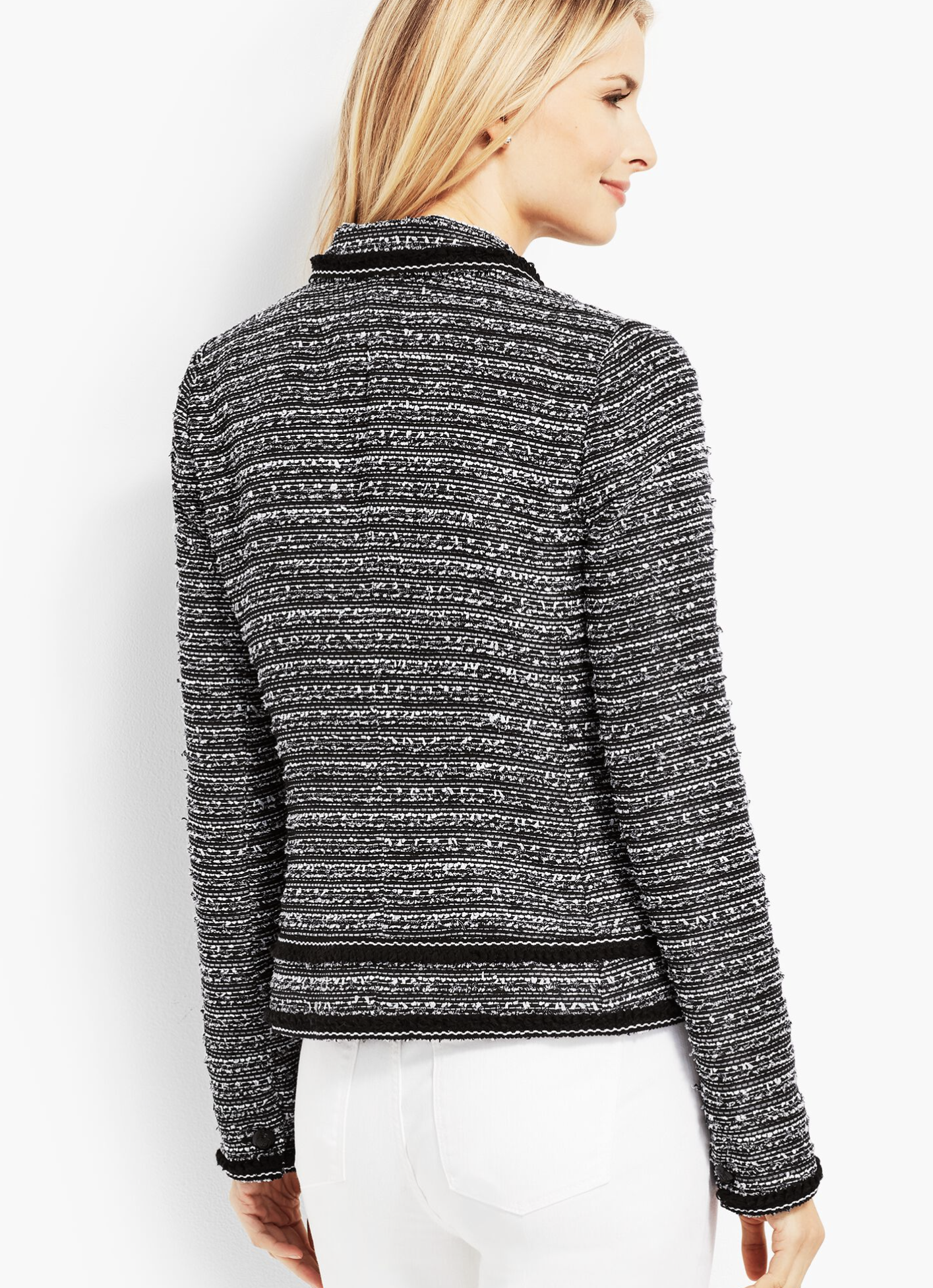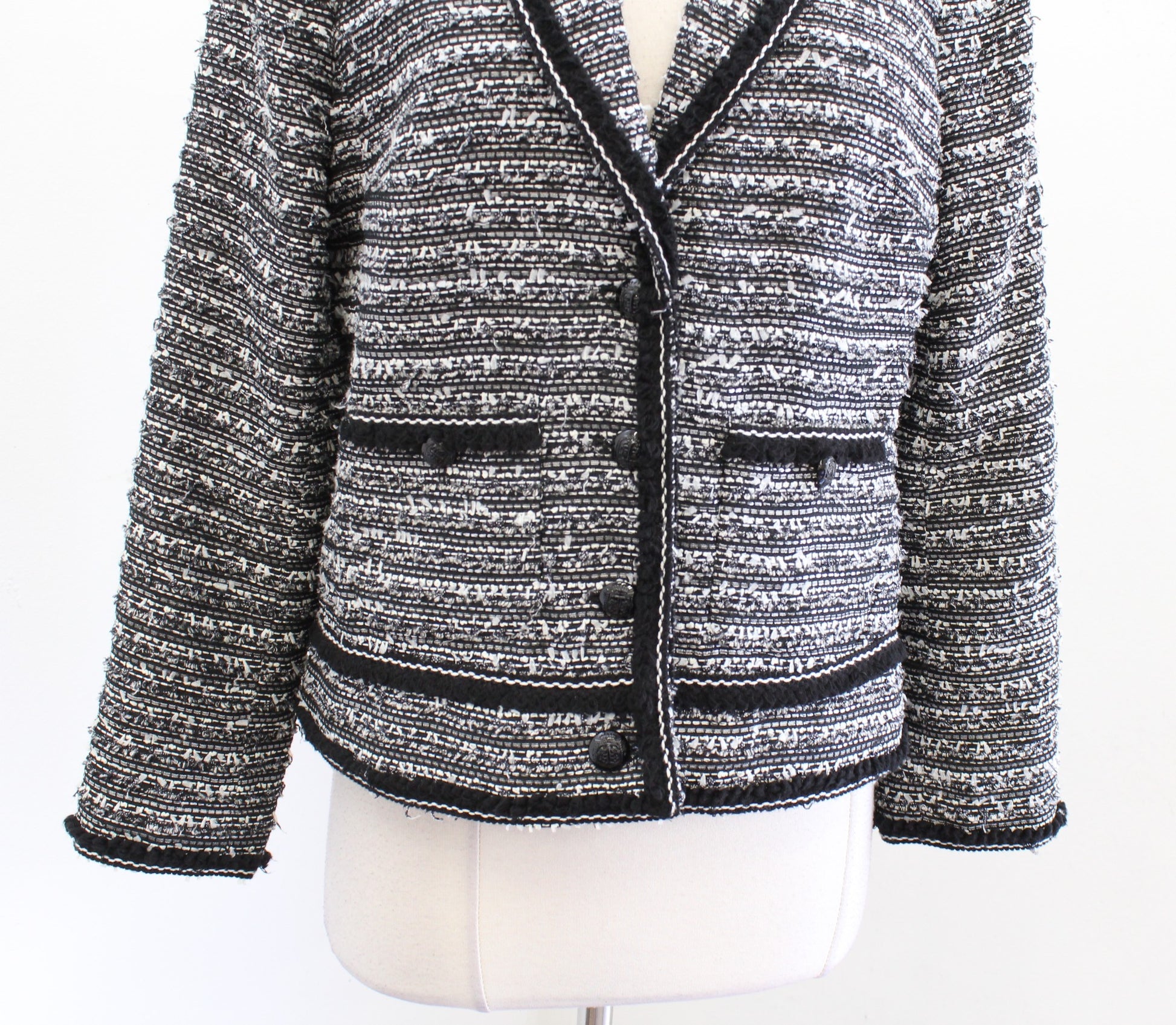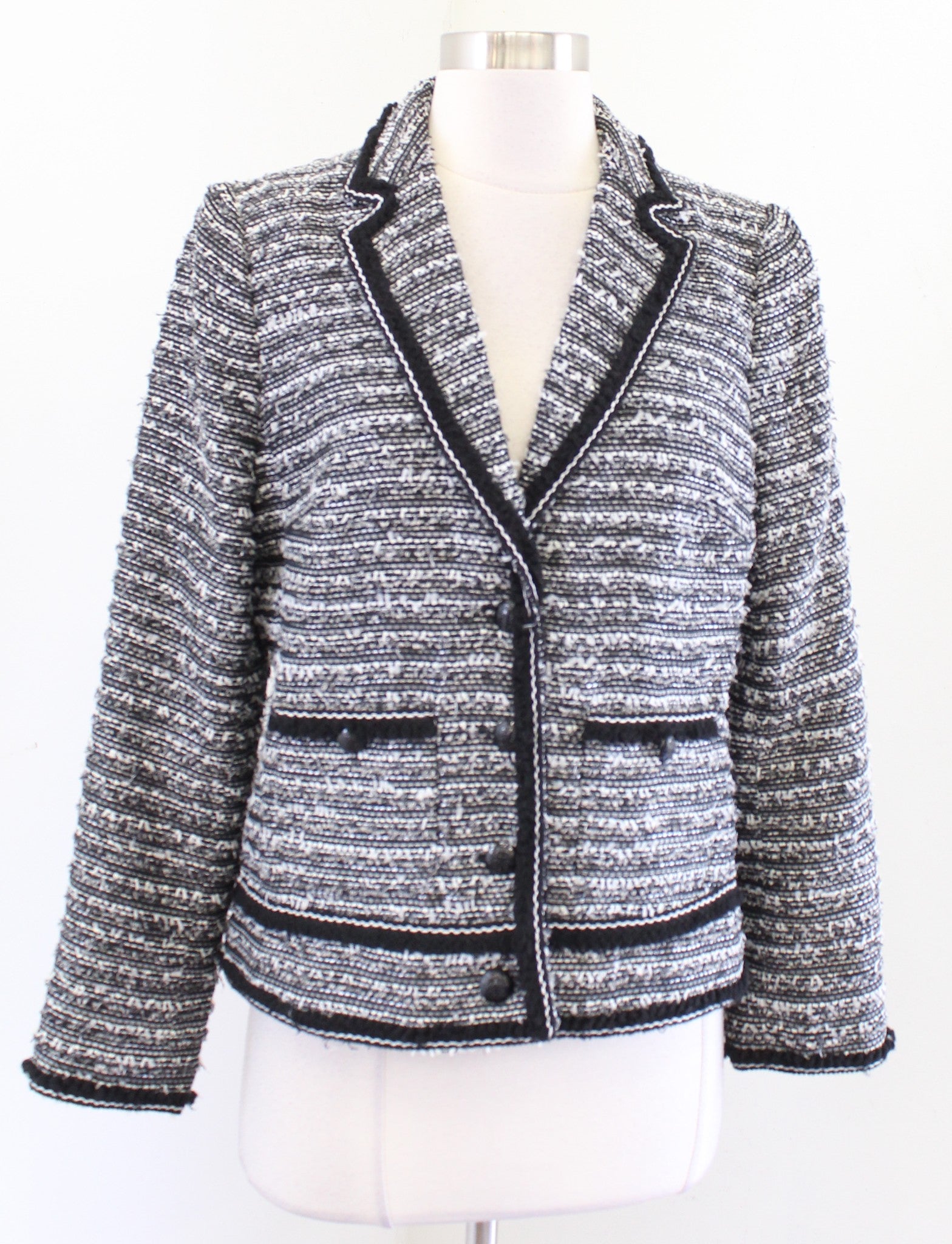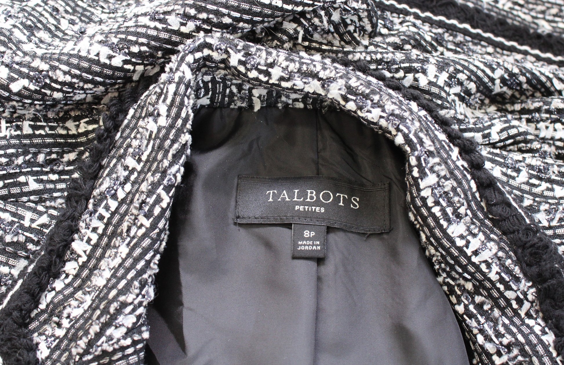 Talbots Womens Fringe Trim Tweed Blazer Jacket Size 8P Gray Black Career Office