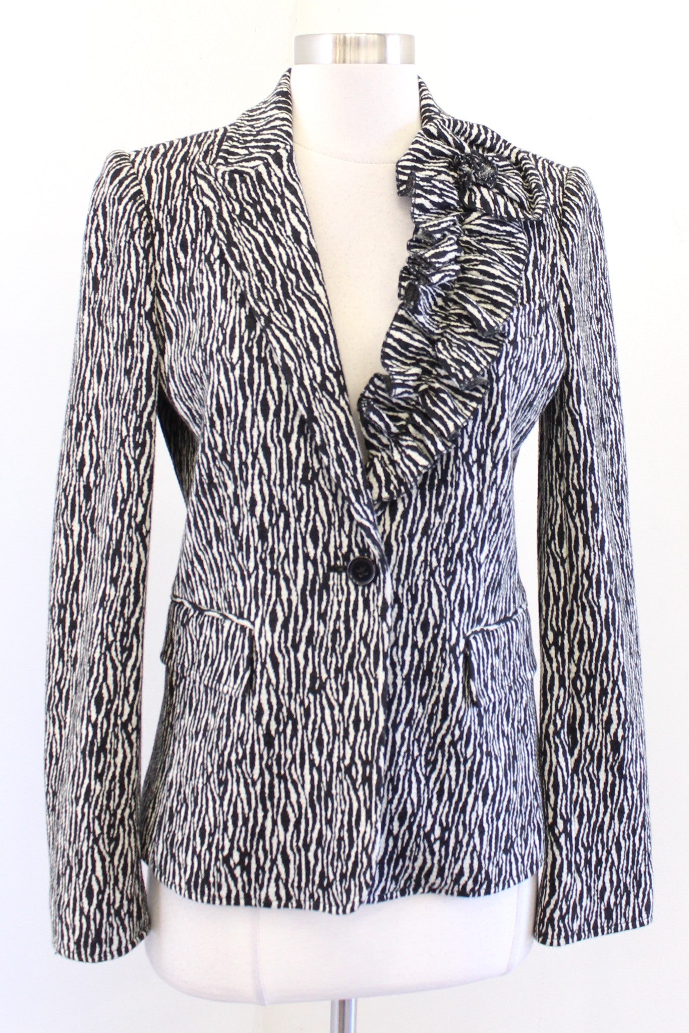 Teri Jon Black Off White Zebra Print 3D Textured Ruffle Blazer Jacket Sz 6 Wool