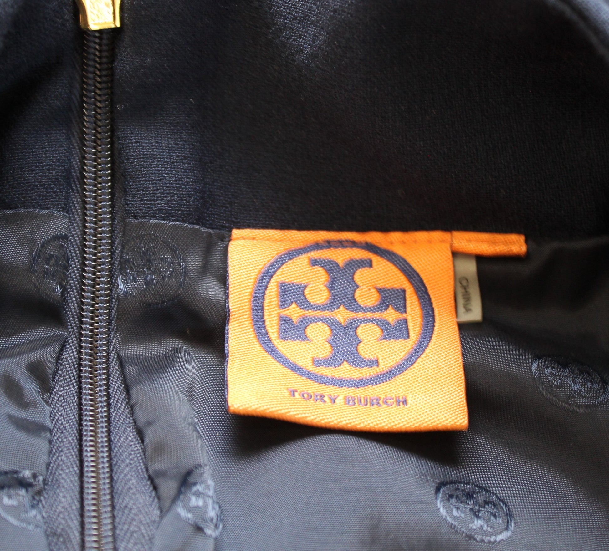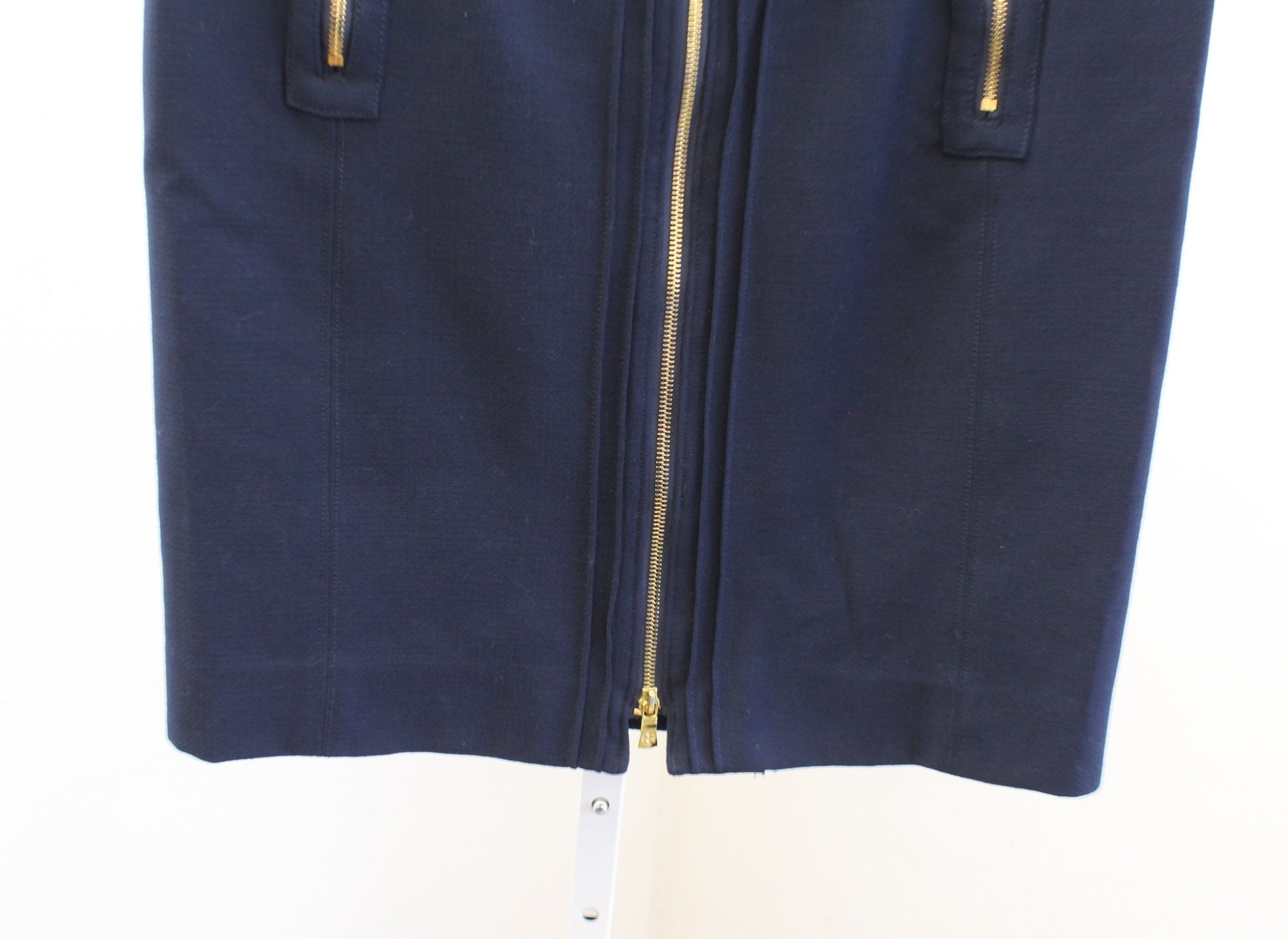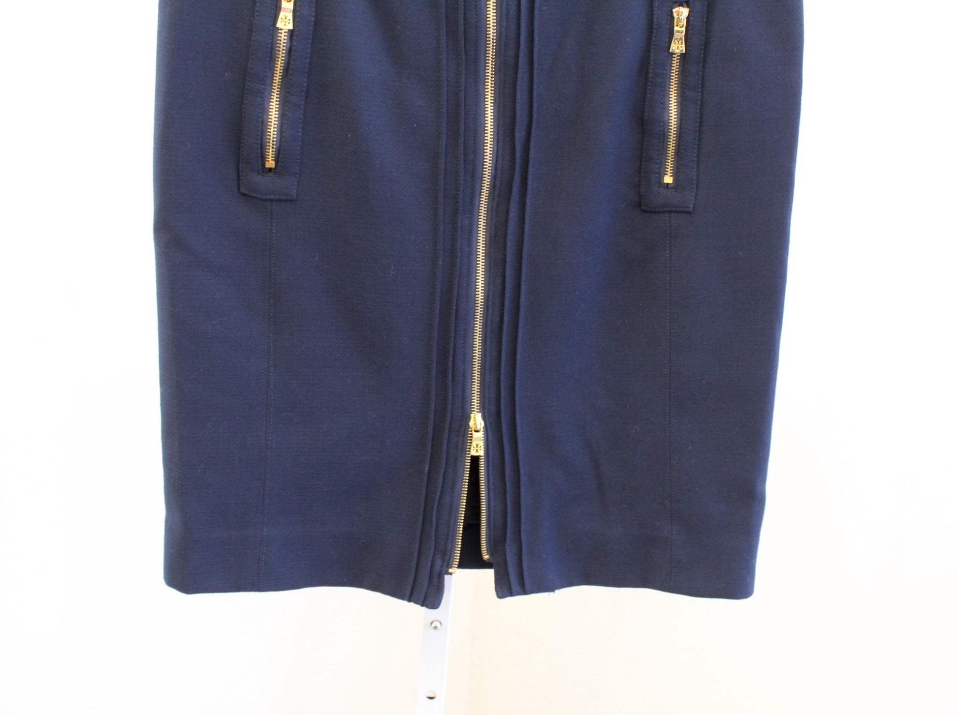 Tory Burch Navy Blue Wool Blend Zipper Accent Pencil Skirt Sz 10 Zip Front Gold