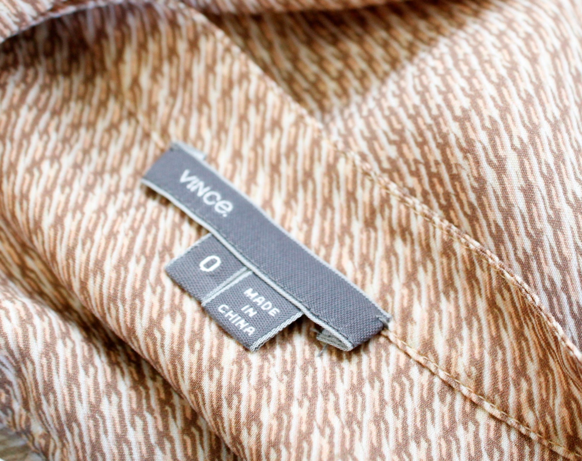 VINCE Tan Brown Diagonal Print Silk Placket Blouse Top Size 0 Geometric V Neck