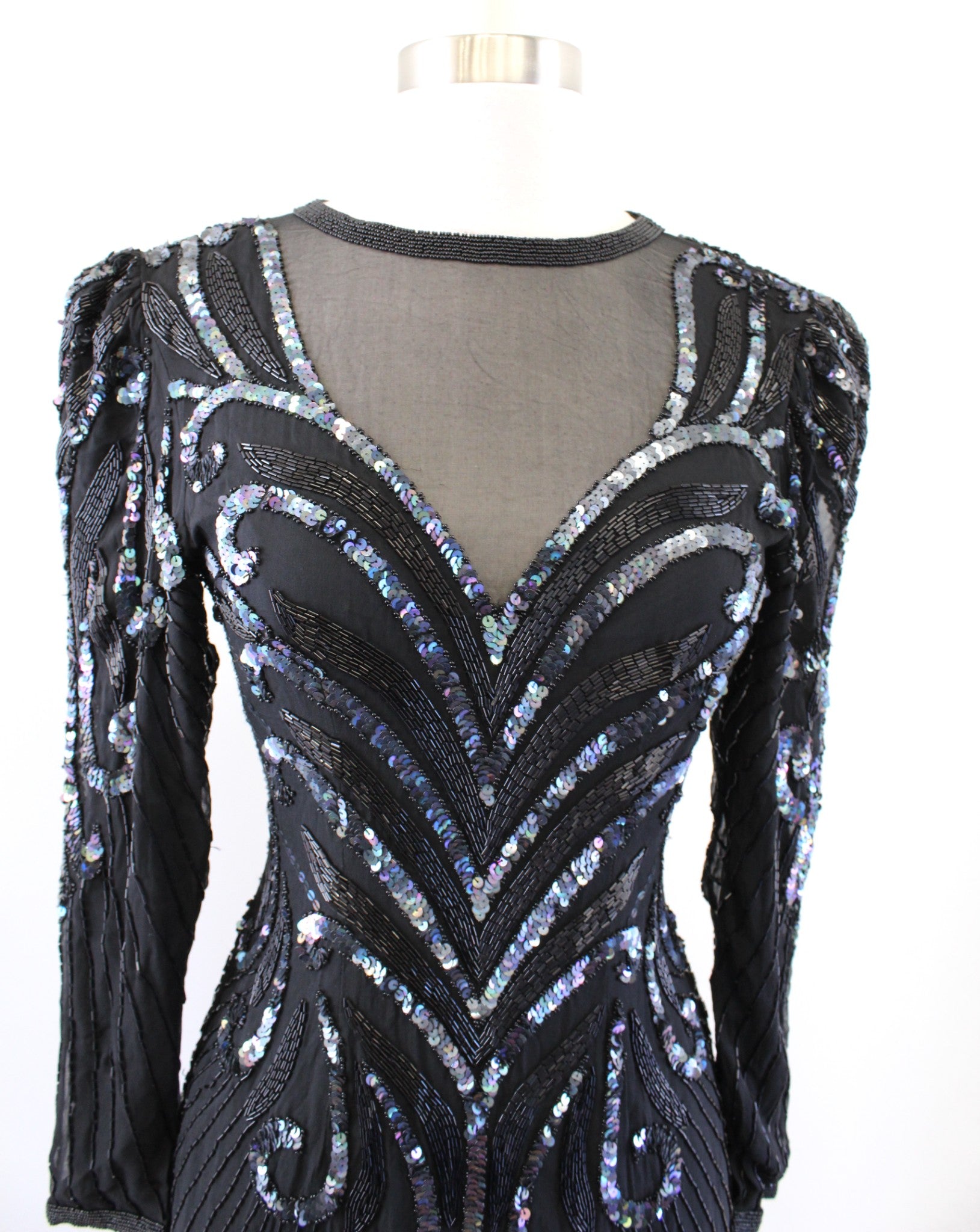Vtg 80s 90s Black Iridescent Silk Beaded Sequin Cocktail Party Evening Dress 2P