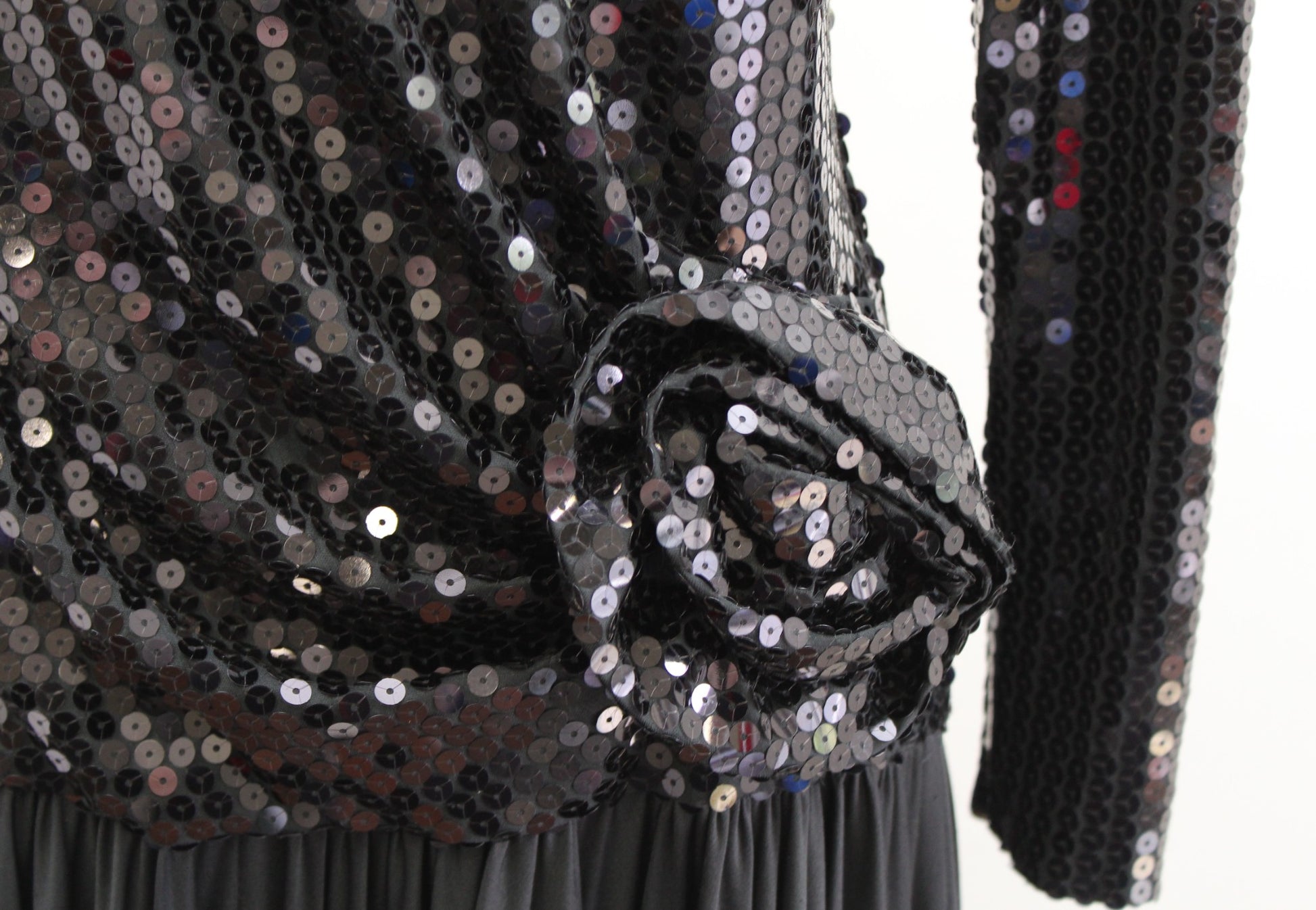 Vtg 80s 90s Tadashi Black Sequin Asymmetrical Hem Ruched Cocktail Party Dress 4