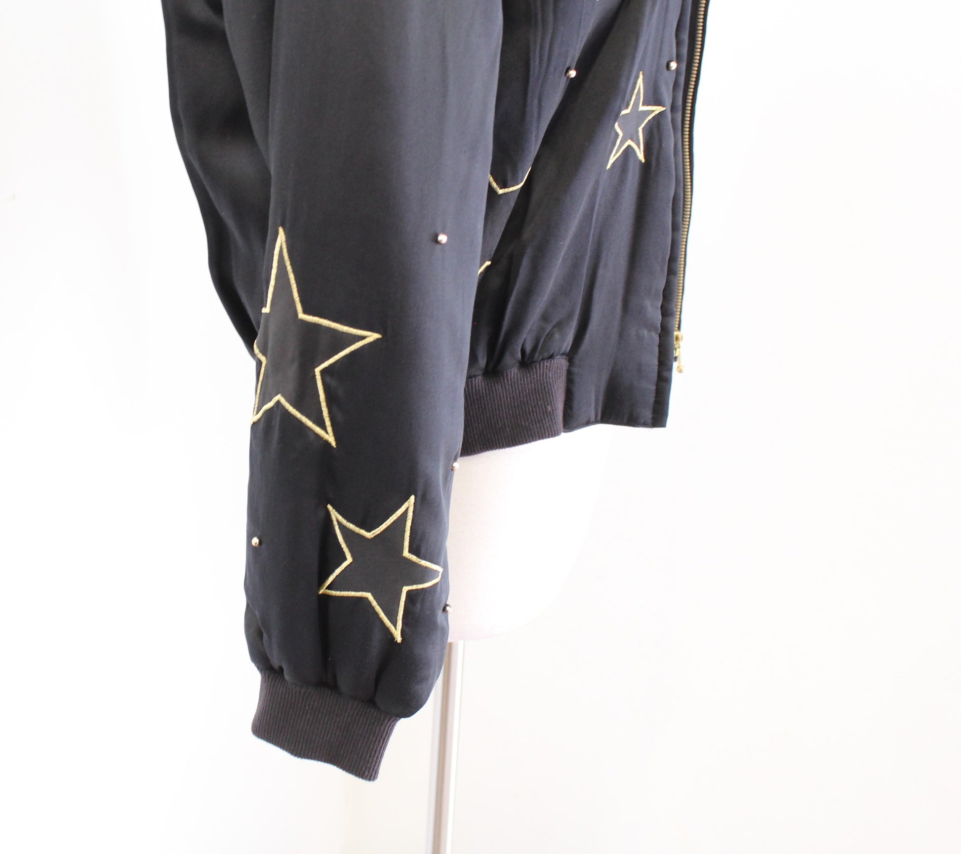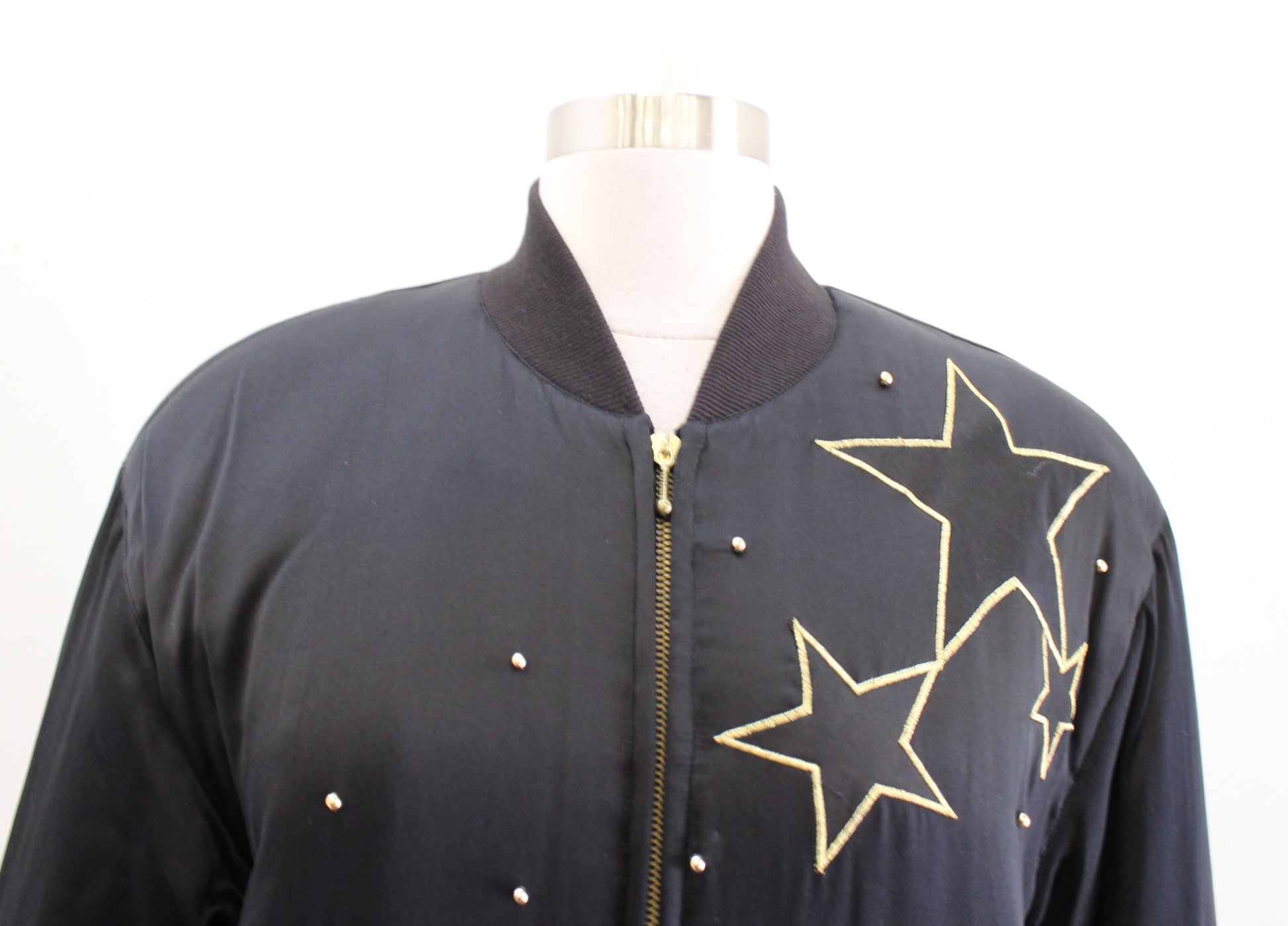 Vtg 90s Black Silk Studded Star Embroidered Puff Bomber Jacket Size S Retro