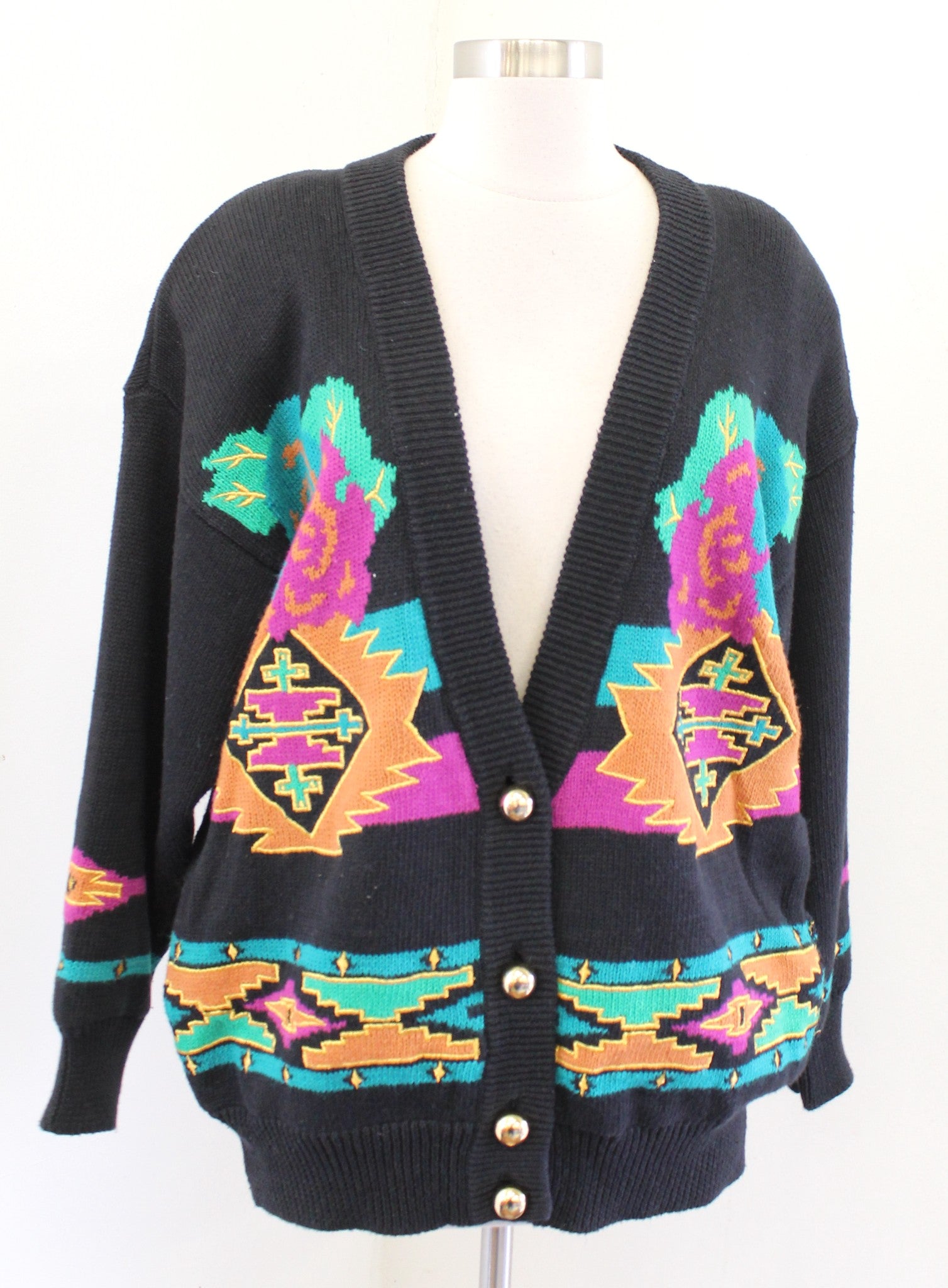 Vtg 90s Black Southwestern Geometric Floral Print Cardigan Sweater Size S Retro