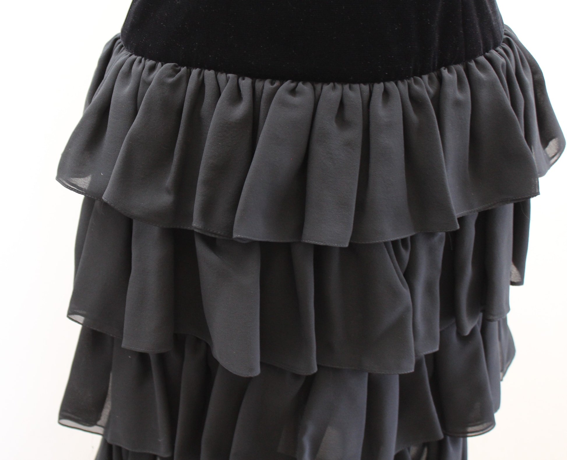 Vtg 90s Black Velvet Drop Waist Ruffle Tiered Cocktail Party Dress SIze 4 Retro