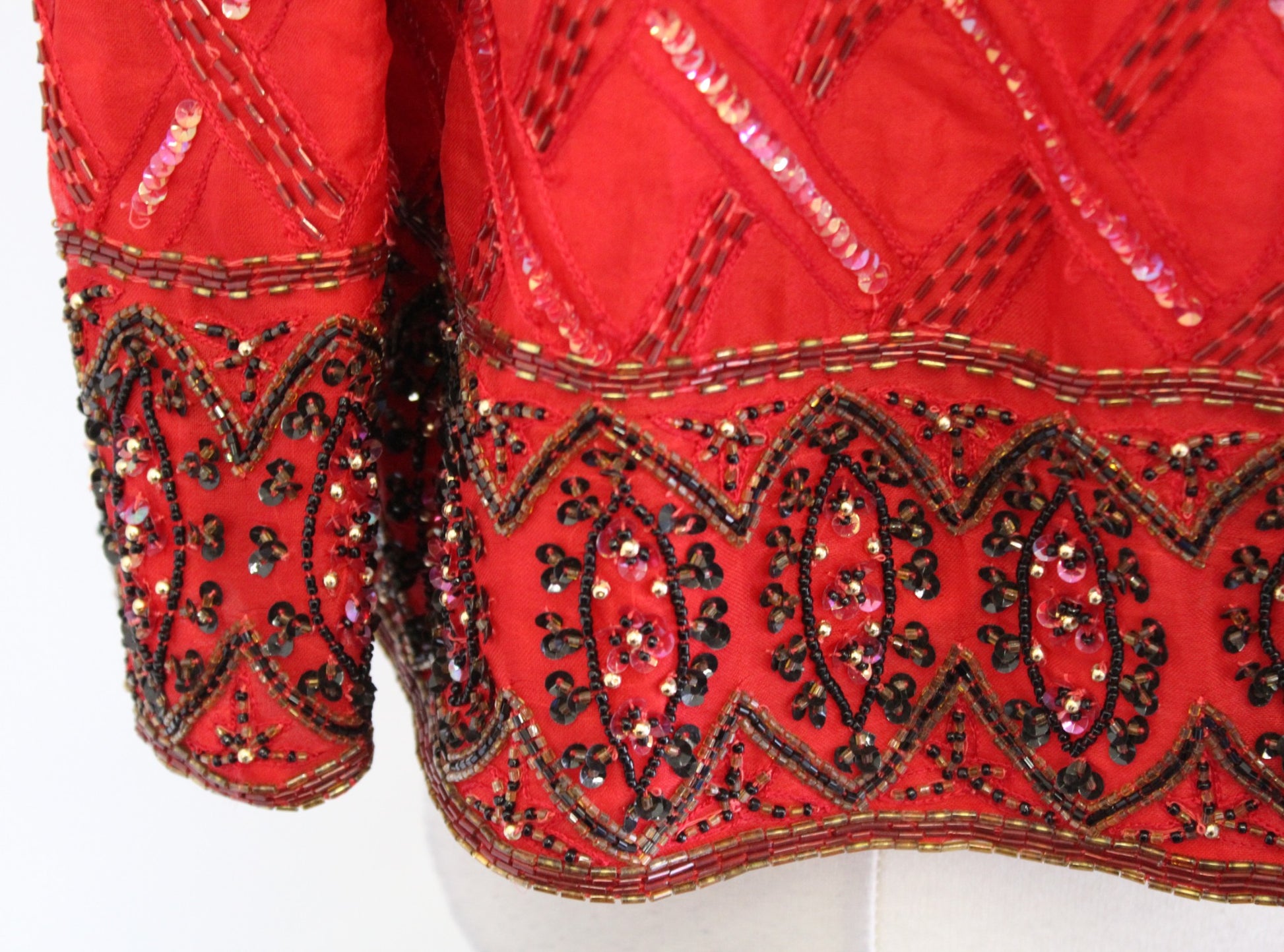 Vtg 90s Red Gold Silk Embellished Beaded Sequin Evening Party Jacket Size M
