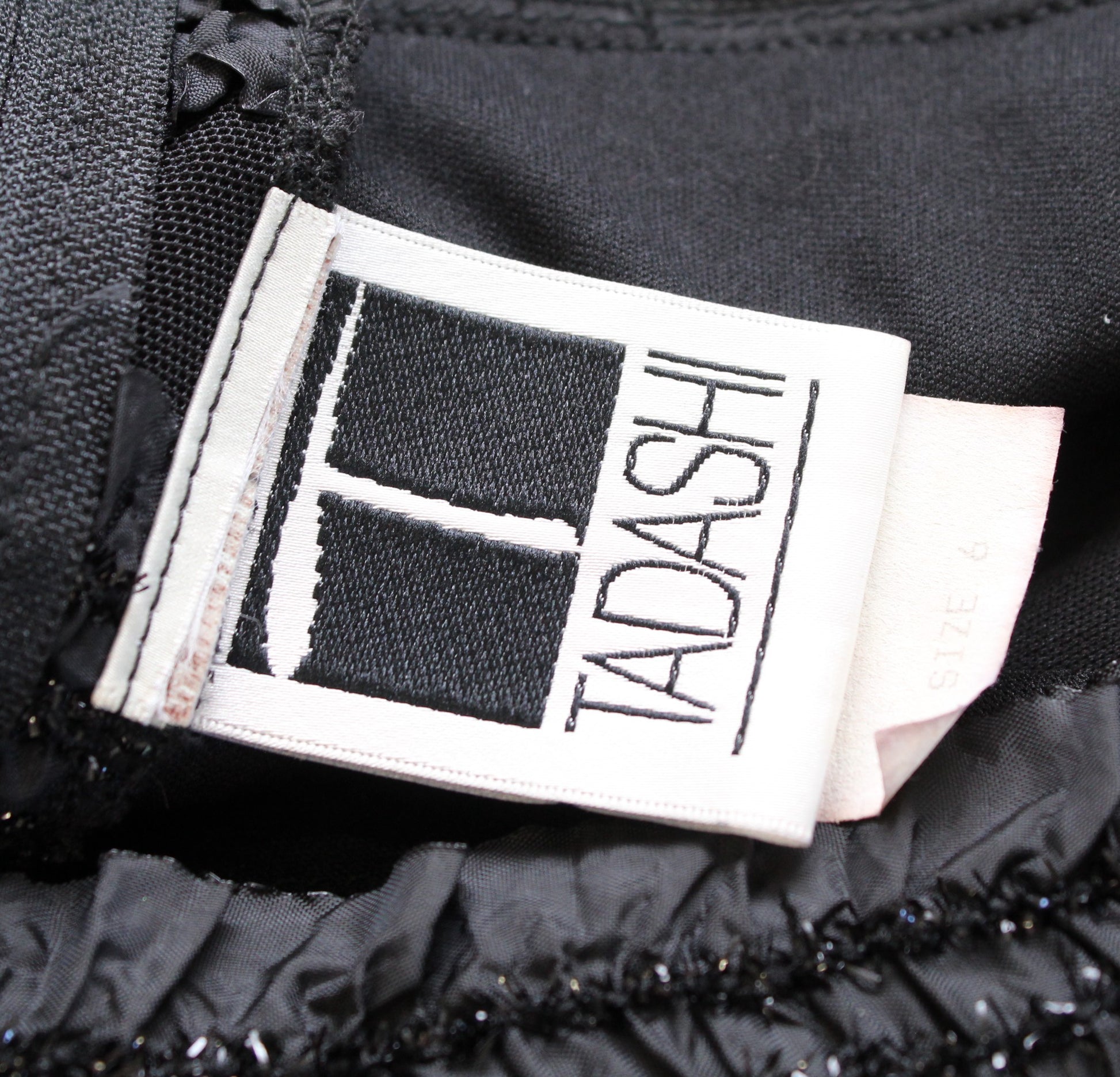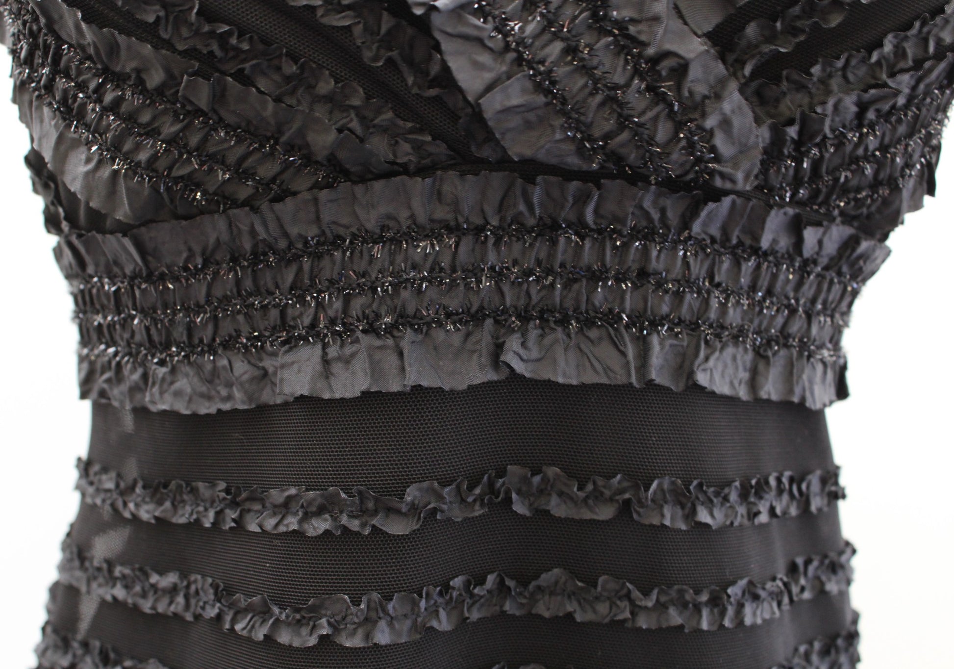 Vtg 90s Tadashi Black Mesh Metallic Ruffle Striped V Neck Cocktail Party Dress 4