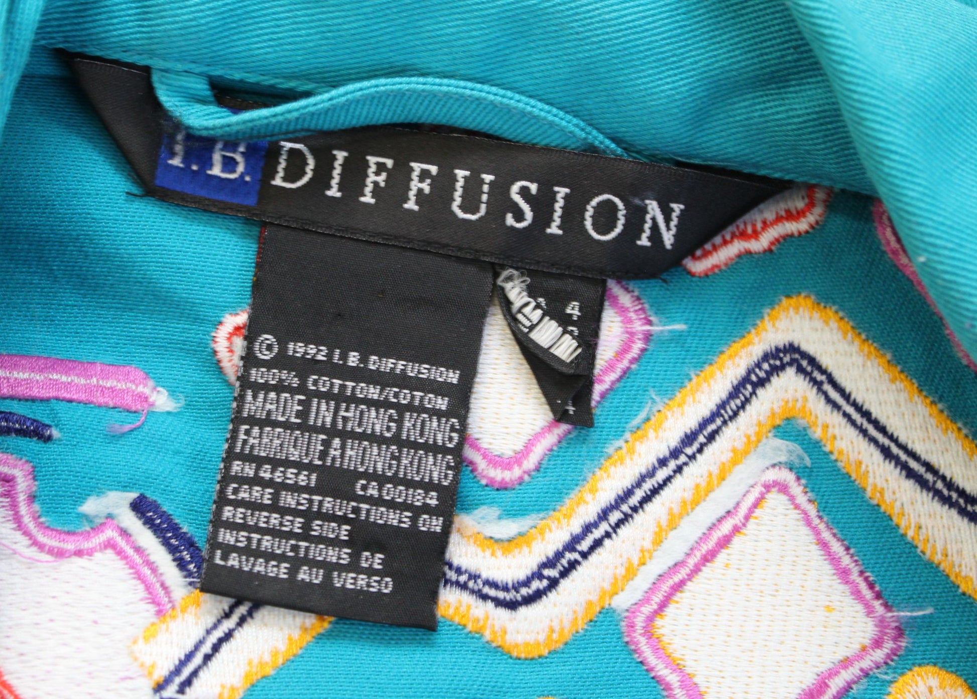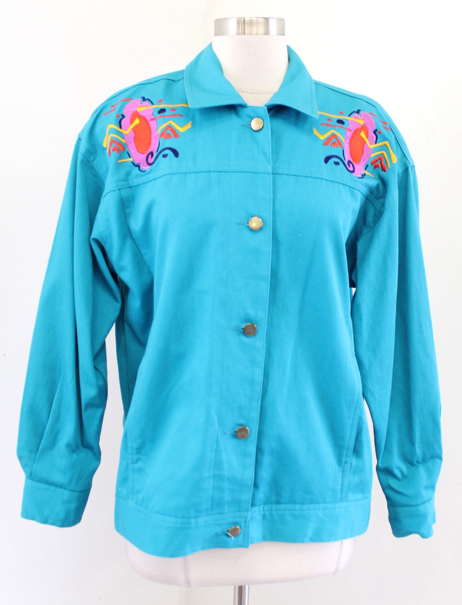Vtg 90s Teal Blue Geometric Embroidered Trucker Jacket Size 4 / S Retro Artsy