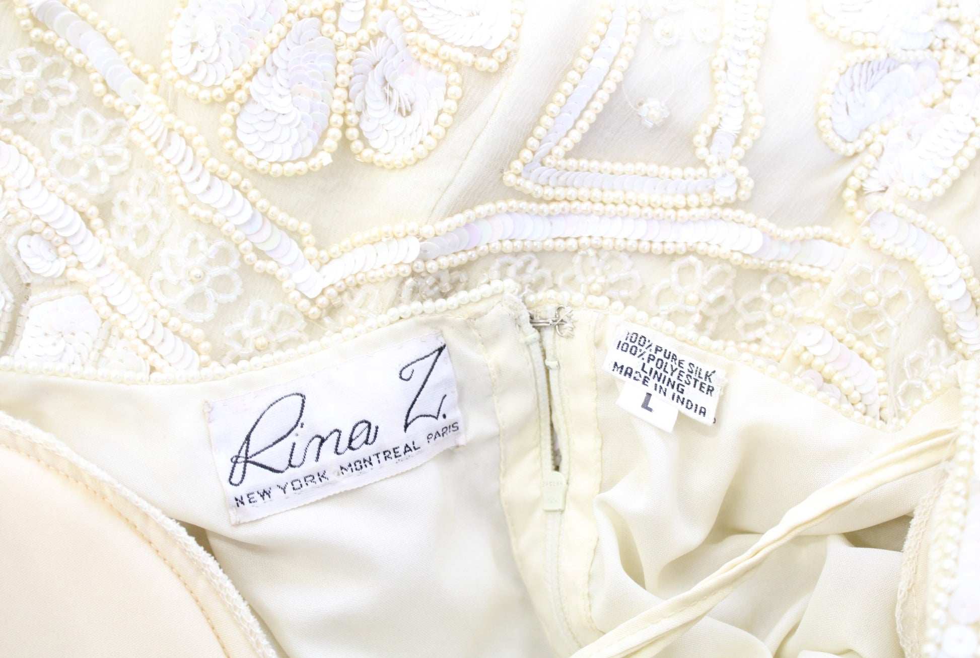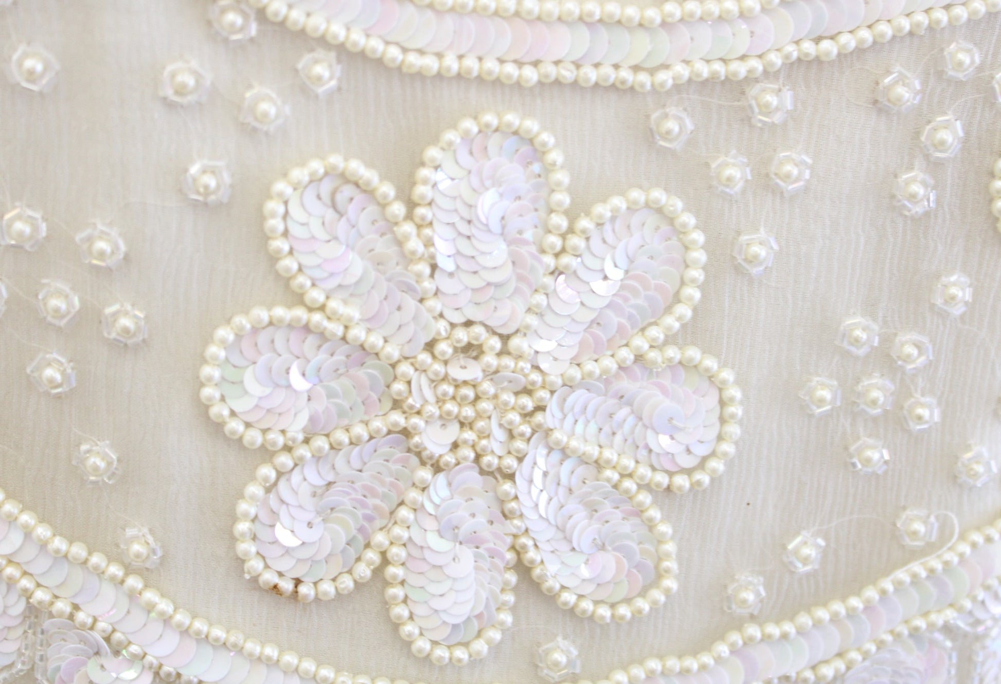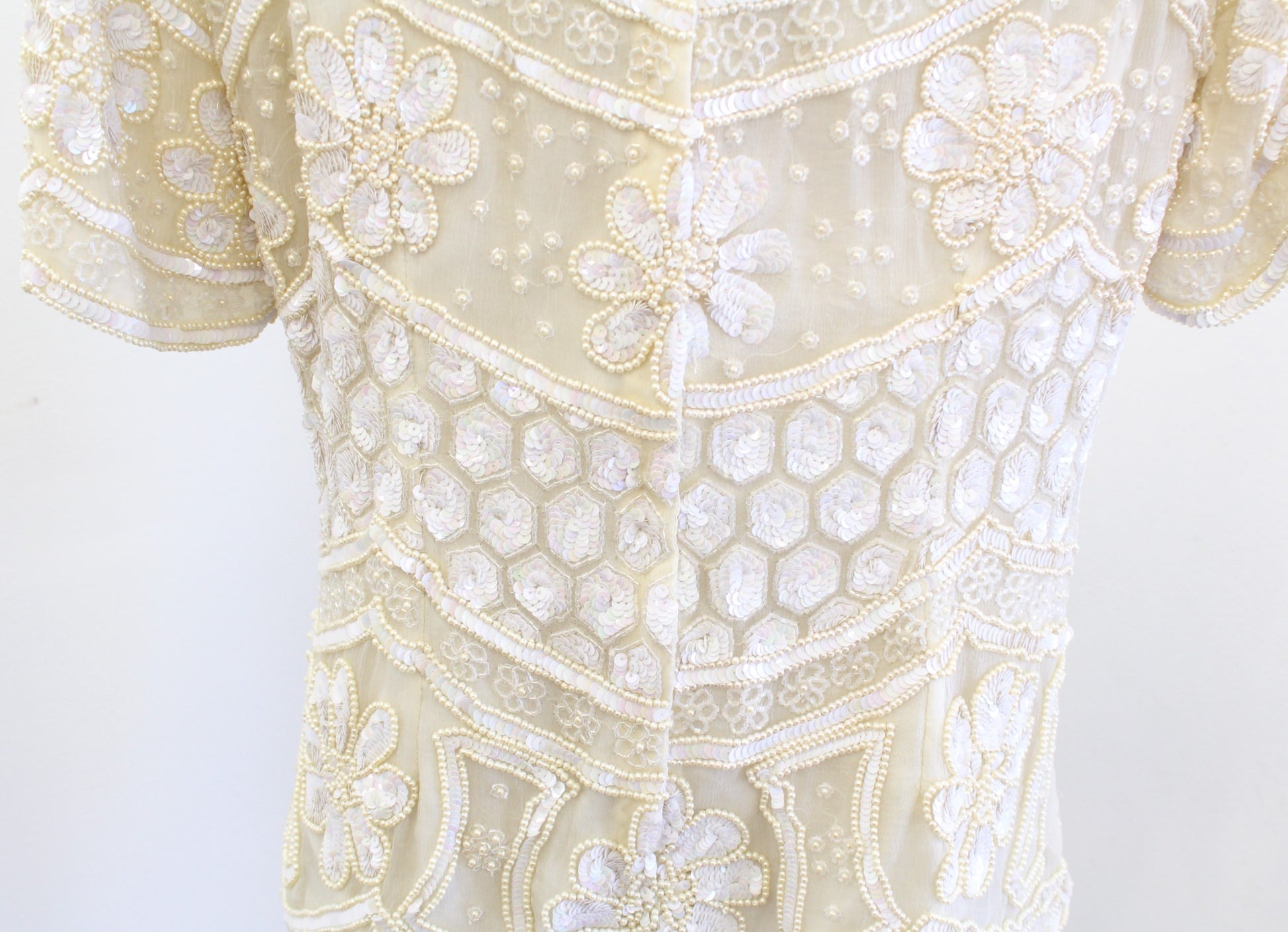 Vtg Cream Beige Pearl Floral Silk Beaded Sequin Evening Party Top Blouse Size L